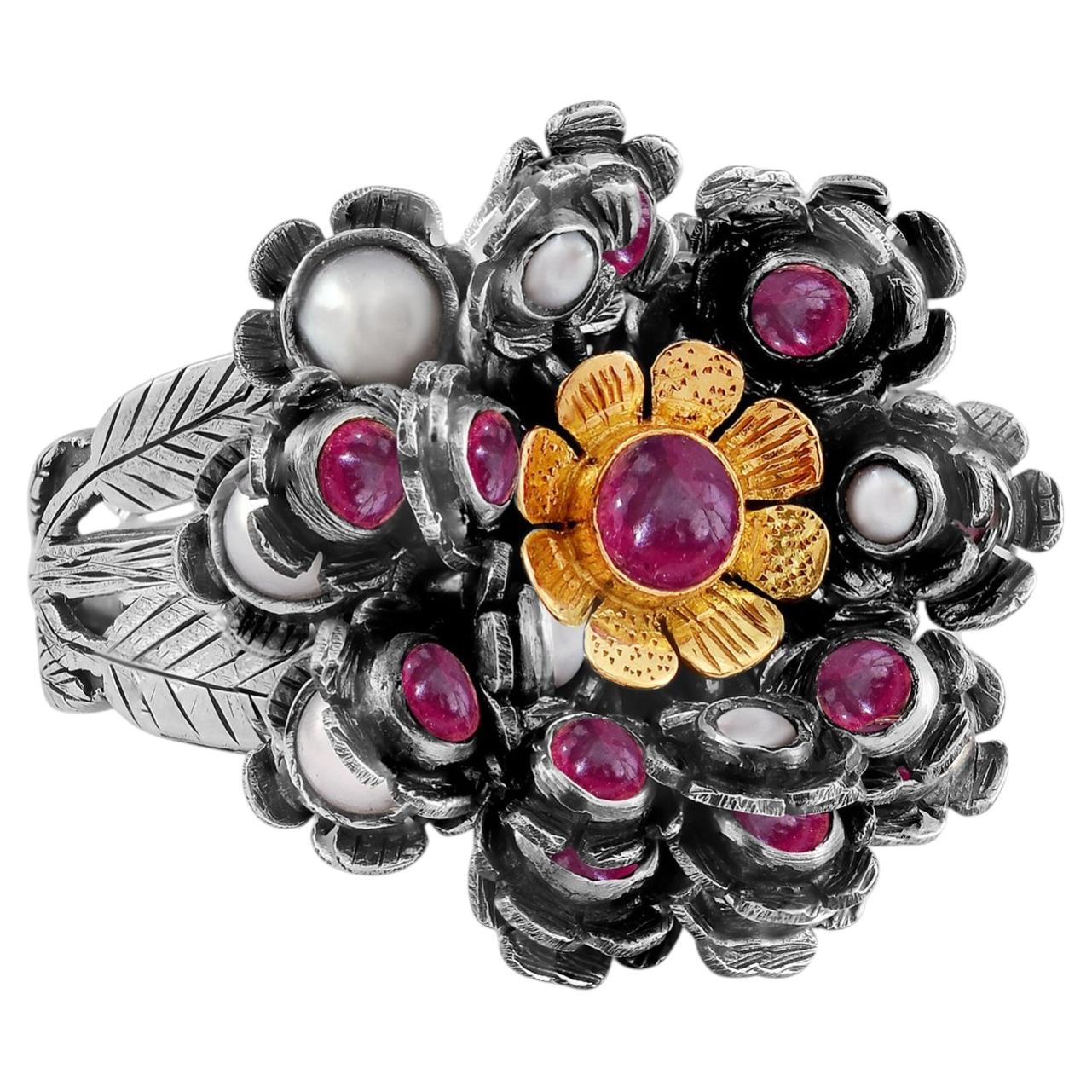 Un precioso anillo de cóctel de turmalina rosa único en su especie. Este anillo presenta una turmalina rosa central, engastada en plata de ley oxidada grabada a mano, y flanqueada ...