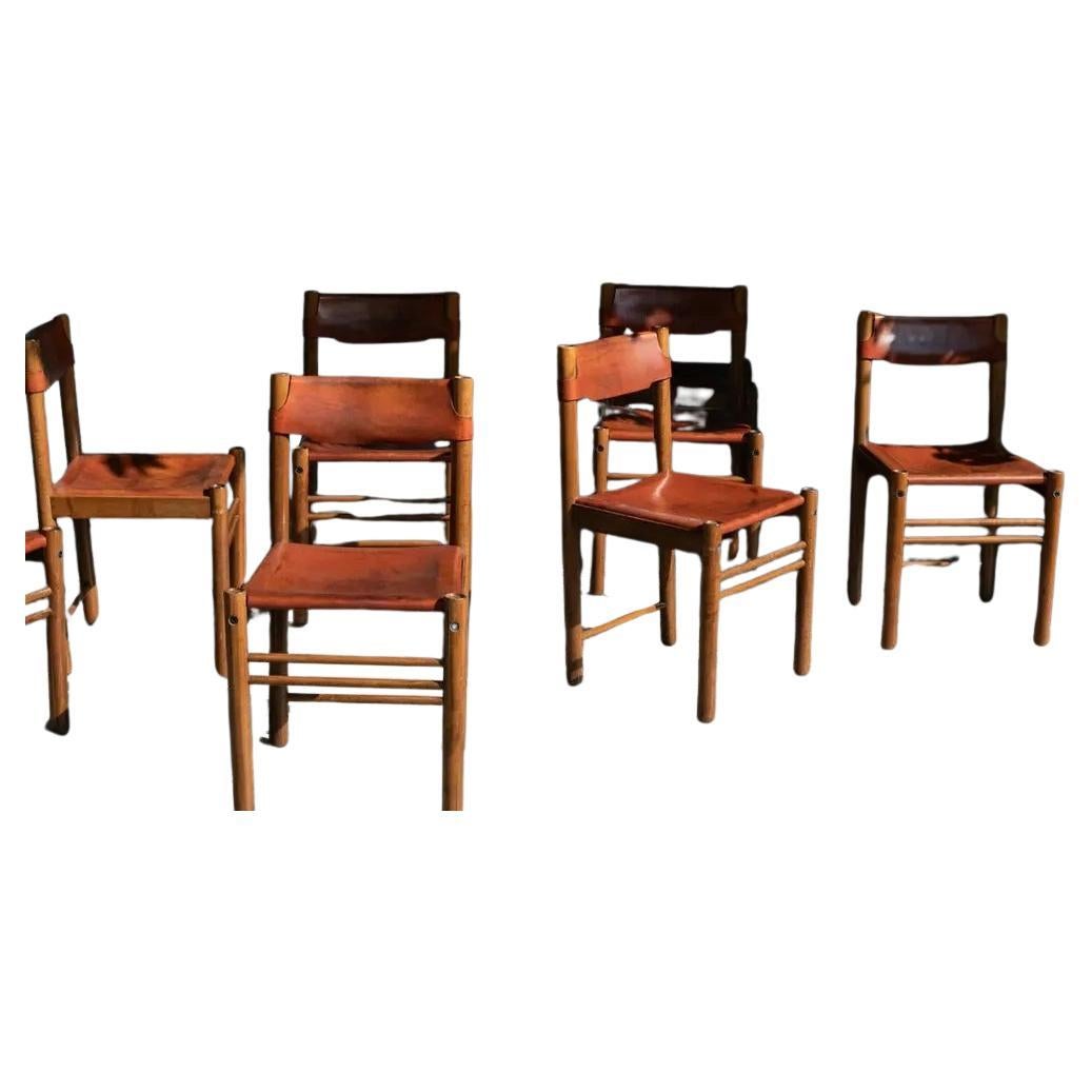 Conjunto de 8 sillas "Solaris" de Franco Vattolo para Ibisco. Armazón de nogal macizo y asientos de cuero natural. Un ingenioso sistema de fijación une la parte de asiento a la estr...
