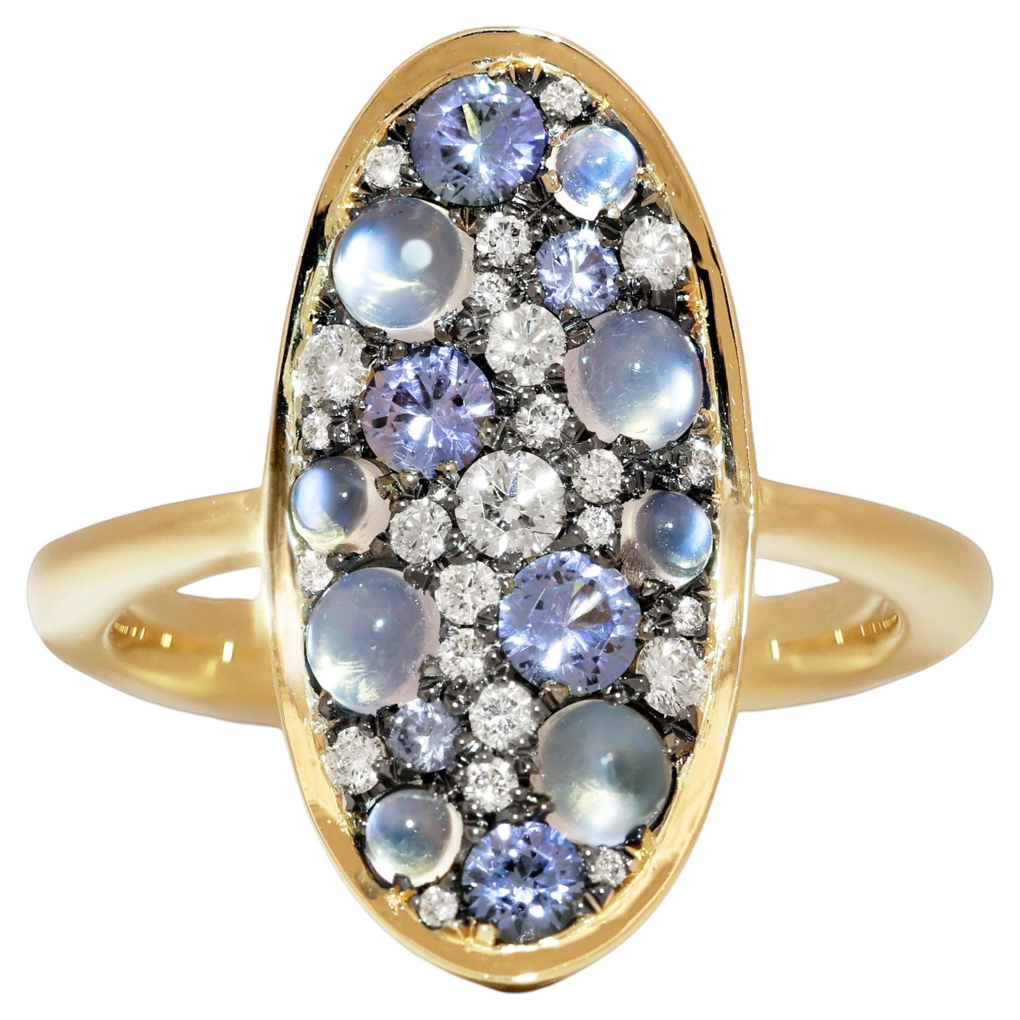 Este anillo único de oro amarillo de 18 quilates, hecho a mano en Bélgica por la diseñadora de joyas Joke Quick, muestra un Combinación de piedras lunares de Ceilán, zafiros azules,...