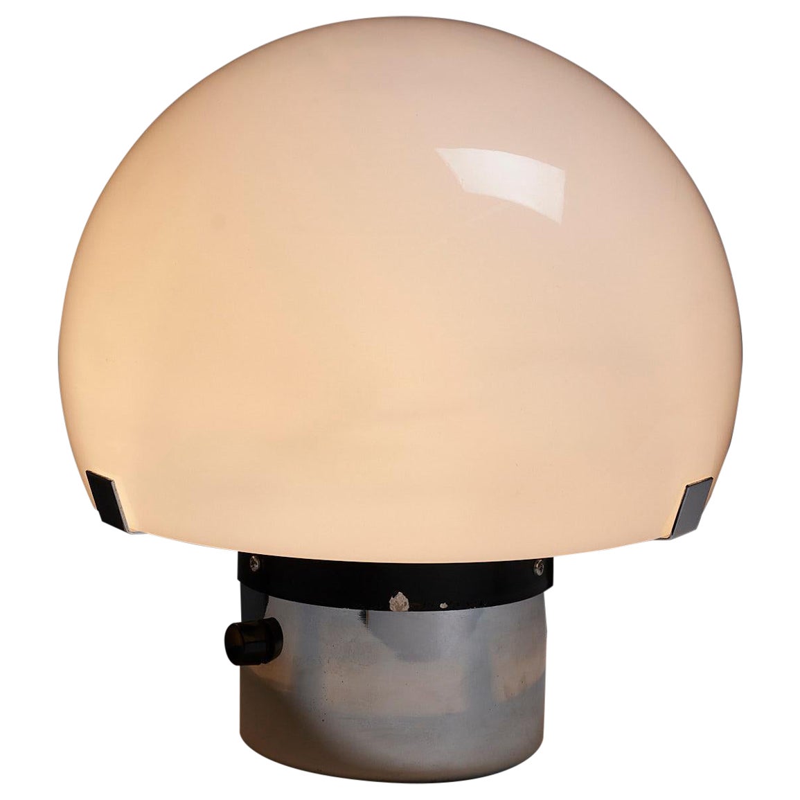 Importante lámpara de sobremesa diseñada por André Ricard en 1969, y producida y fabricada por Metalarte en los años 60 y 70. Estructura de acero cromado y pantalla opalina blanca. M...