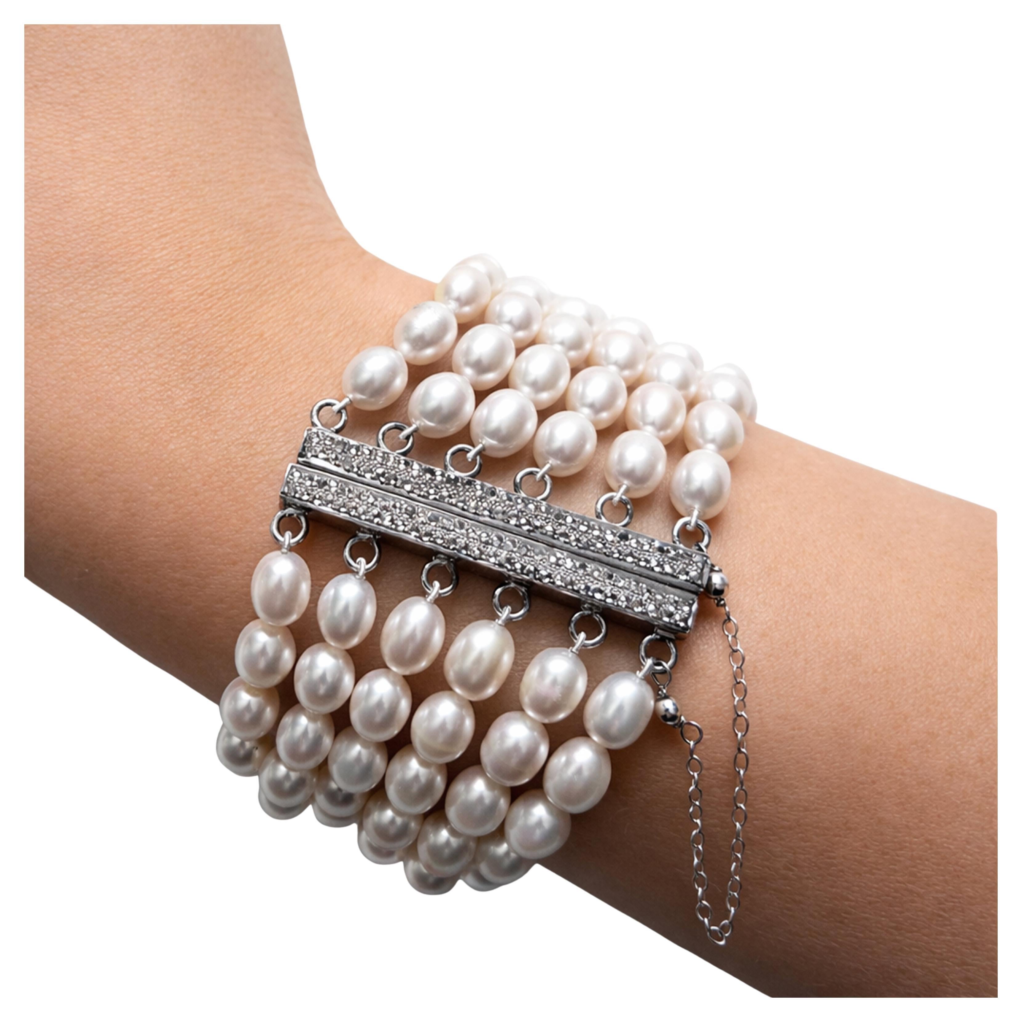 Descripción Una pulsera brazalete flexible, atrevida pero elegante, de perlas de agua dulce impecablemente lustrosas. Diseño exclusivo con pavé de diamantes, plata de ley rodiada, fu...