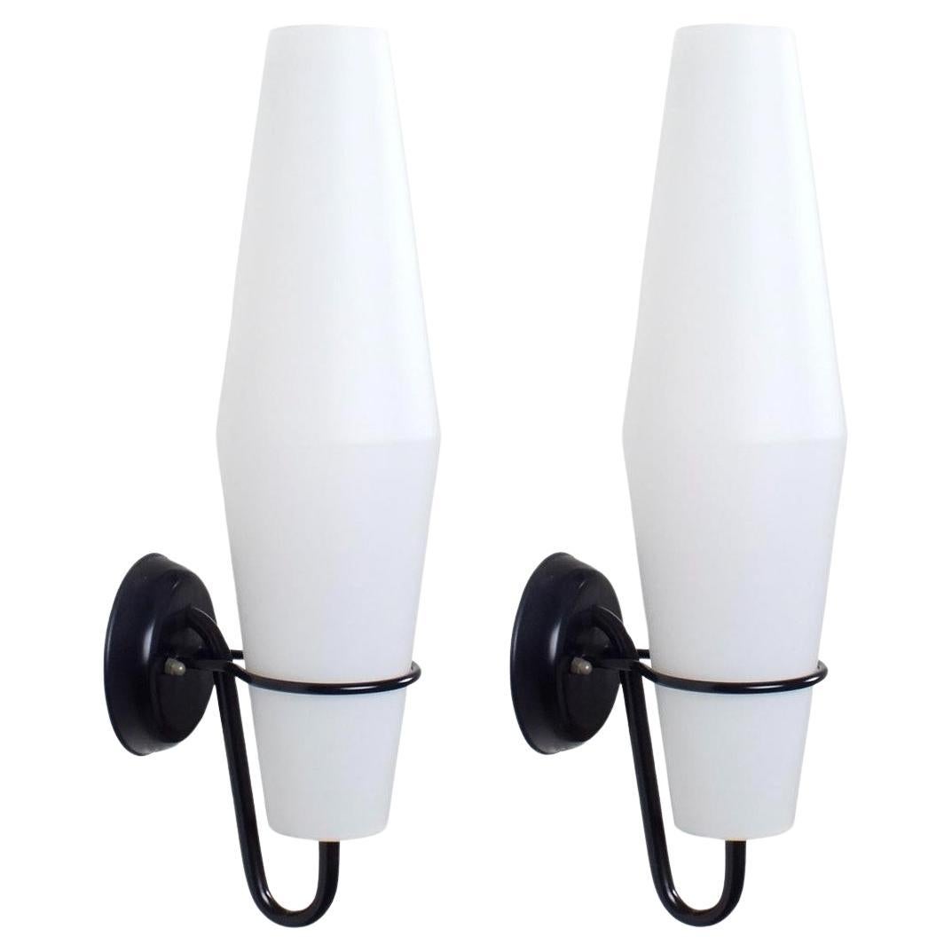 Maravillosa pareja de elegantes apliques en blanco y negro con altas pantallas de cristal, fabricados por Raak hacia 1960. Etiqueta original. Rewired. Dos pares disponibles