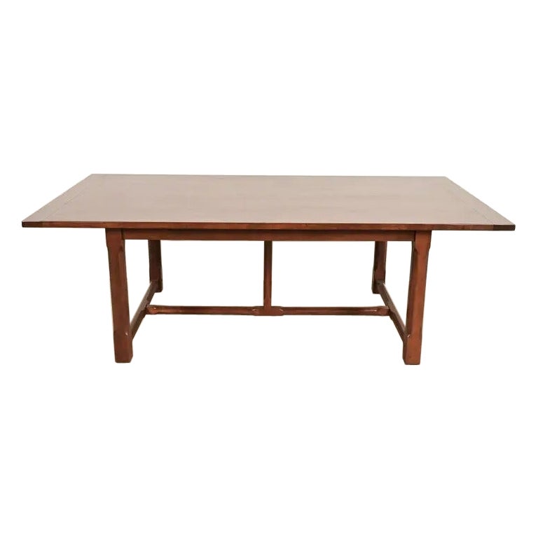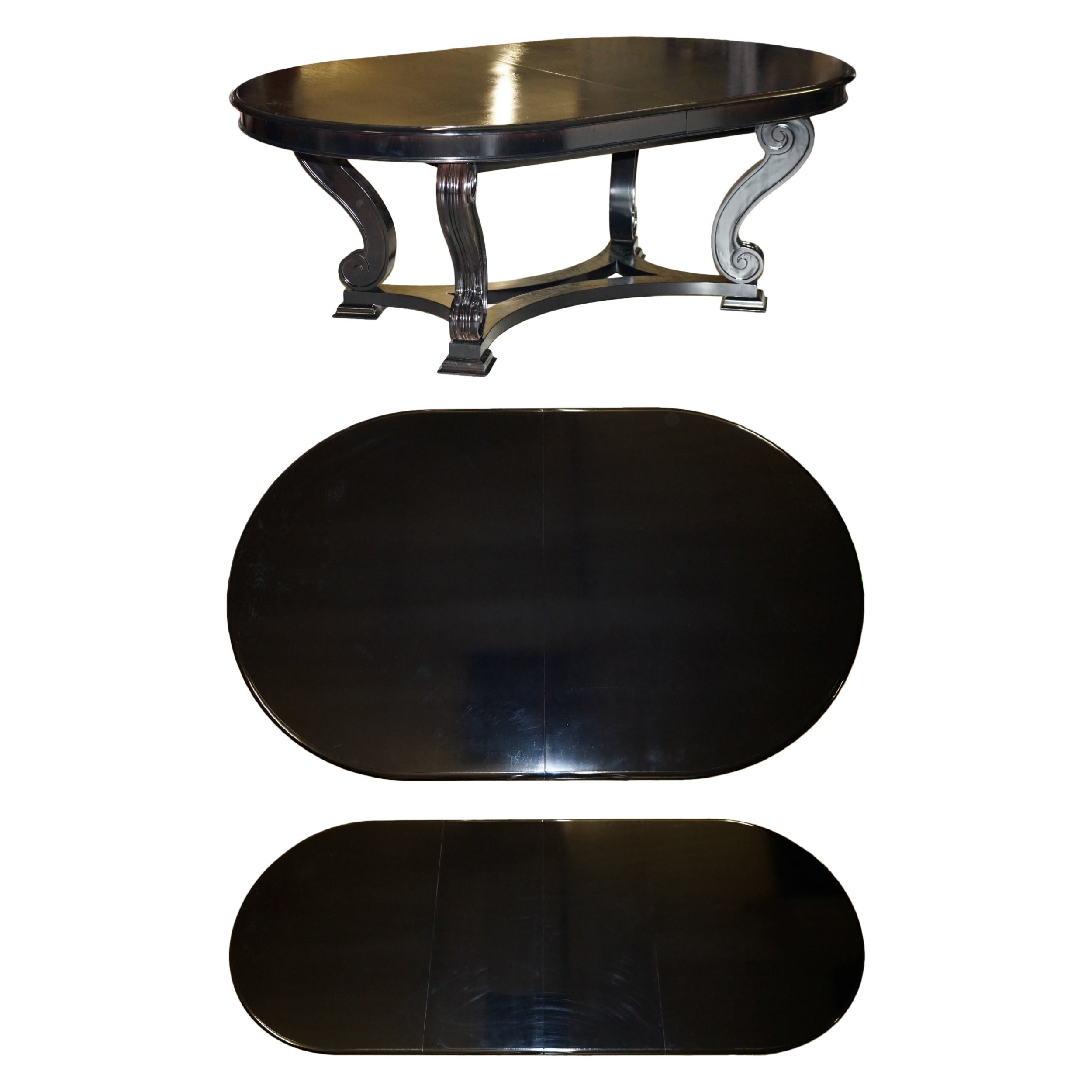 Una llamativa mesa de comedor rectangular Ralph Lauren con un grueso tablero de caoba lacada en negro sobre una base de caballete tubular de acero pulido con un espectacular acabado ...