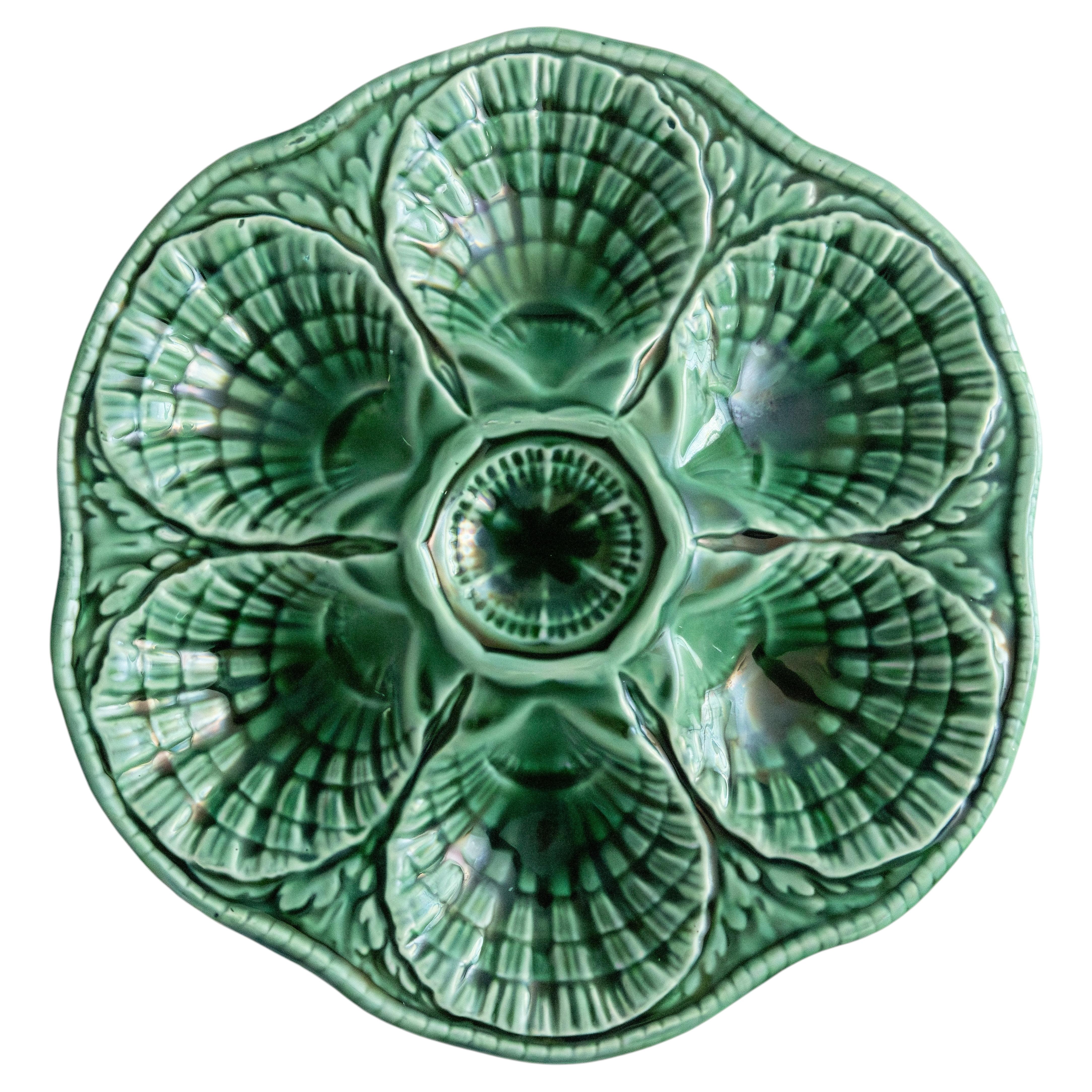 Plato de ostras de mayólica Sarreguemines, hacia 1870. 6 Conchas y espacio para el limón en el centro. Modelo antiguo.