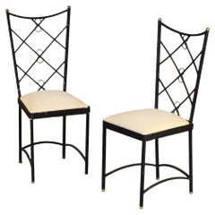 Refinado juego de cuatro sillas francesas, de hacia 1950, fabricadas en hierro forjado con detalles de latón y diseñadas en el elegante estilo neoclásico asociado a André Arbus. Cada...