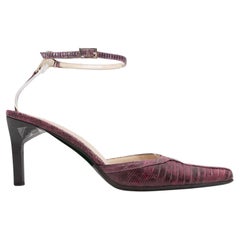 Zapatos de tacón con puntera en punta de piel repujada en morado oscuro de Gucci. Tacones apilados. Cierres de hebilla en las correas del tobillo. Tacón de 3 cm de altura.