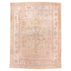 Alfombra antigua Oushak con suave medallón central en marfil rubor y albaricoque desteñido
