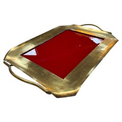 Bandeja de servir italiana de mediados de siglo, con marco de latón martillado y asas laterales integradas, centrada con un panel de laca roja viva. El cálido acabado metálico y el a...