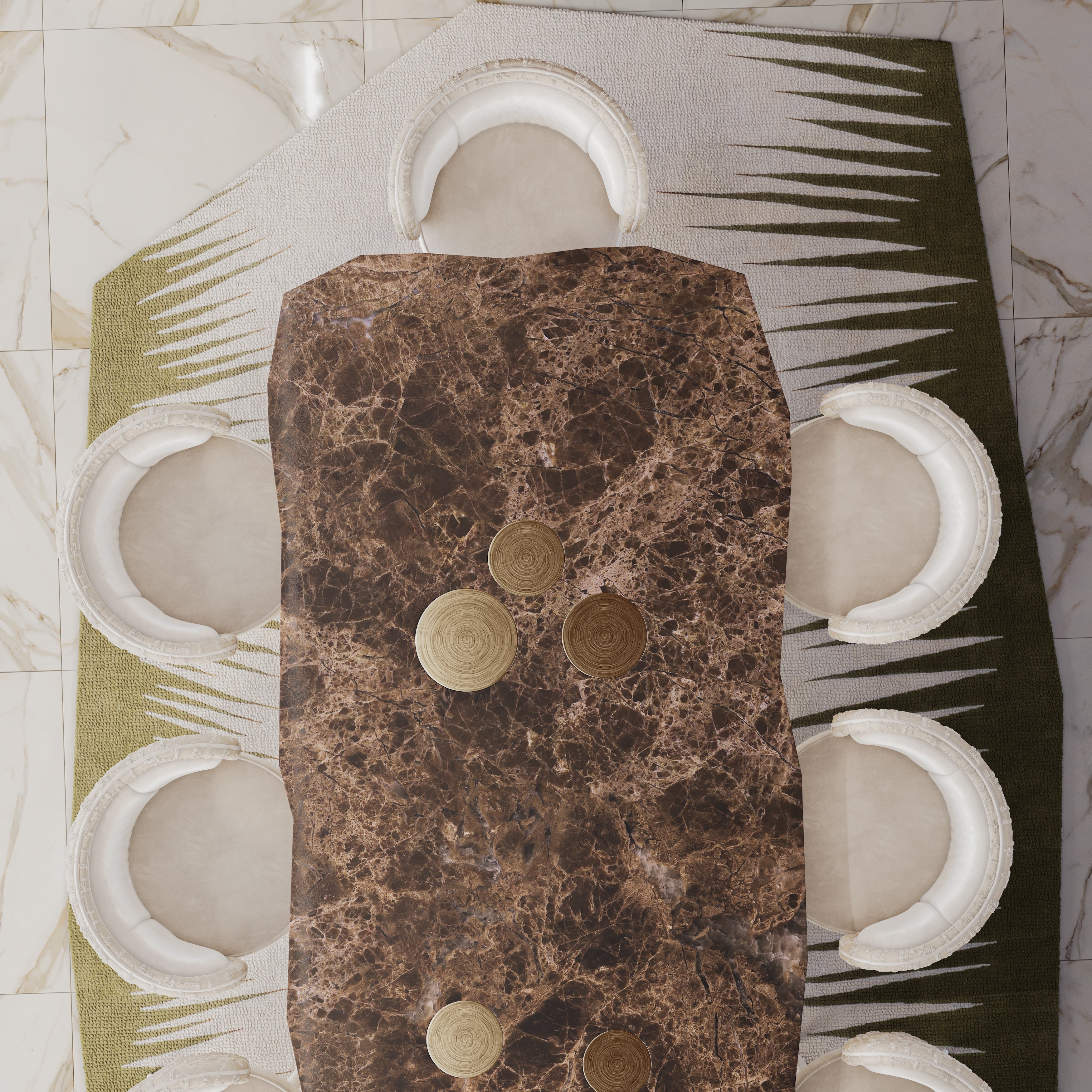 Cadenza Dining Table The Cadenza’s table top pays homage to craftsmanship and the composition of material and line. Its contouring draws inspiration from the rhythm and freedom of waves - a play between sound and quietness - a cadence sculpted in form and silhouette. Adorned with intricate inlays reminiscent of tree rings, the table top, refined yet commanding, floats above a striking pedestal base: an interplay of asymmetry and balance.