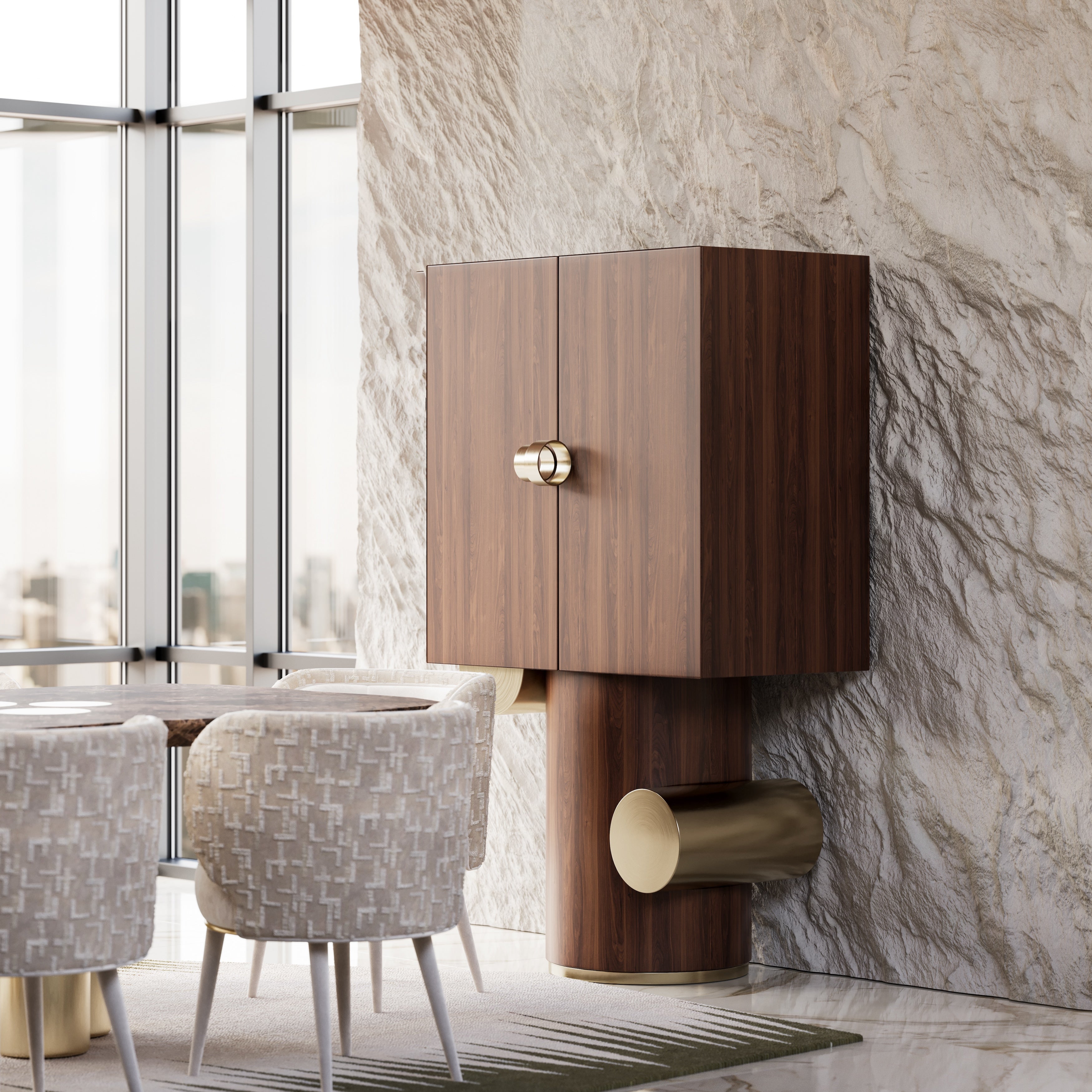Antigua Sideboard The Antigua Sideboard challenges conventional design with its expressive form and sculptural character. Boldly asymmetrical yet highly composed, its design introduces a sense of movement and intentional disruption. Crafted in wood, the sideboard structure’s clean geometry is elevated by cylindrical legs and irregular brass accents that introduce an element of fun and contemporary flair.
