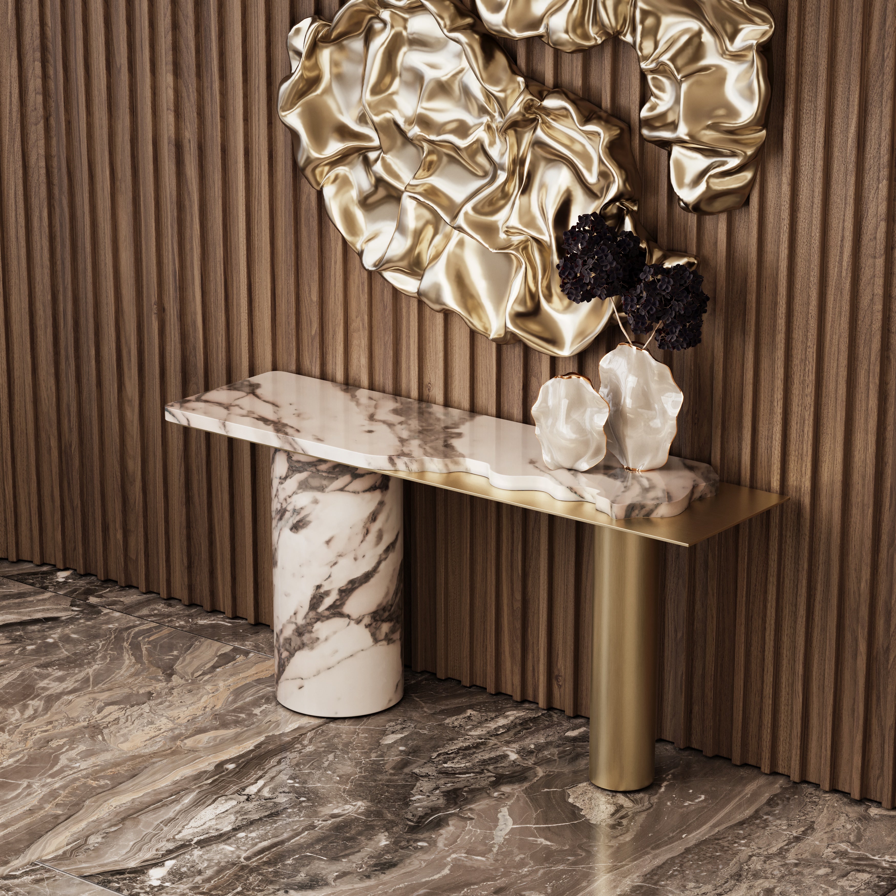 Naya Console A study in balance and materiality, the Naya Console combines the timeless beauty of stone with the warmth of metals. The asymmetrical composition creates a quiet yet striking presence. Subtle, sculptural, and thoughtfully designed, it invites appreciation of texture, proportion, and the interplay of natural and crafted elements. A design for those who seek refinement in details and poetry in form.