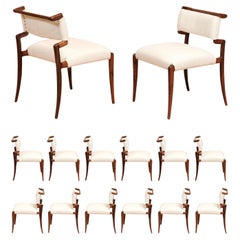 Sofisticado conjunto restaurado de 12 sillas laterales Klismos de nogal según Charles Allen