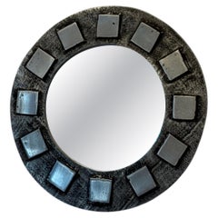 Espejo circular escultural con un característico marco metálico compuesto por elementos cuadrados en relieve espaciados uniformemente ...