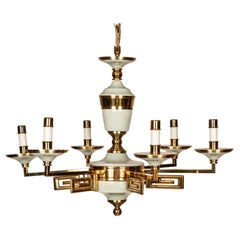 Lámpara colgante francesa de metal dorado y cristal de leche, 1950