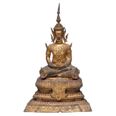 Corona italiana del siglo XVIII tallada a mano y dorada, adornada con cristales de cuarzo rutilo y perlas barrocas. Está montada sobre un fragmento dorado coordinado con una base de ...