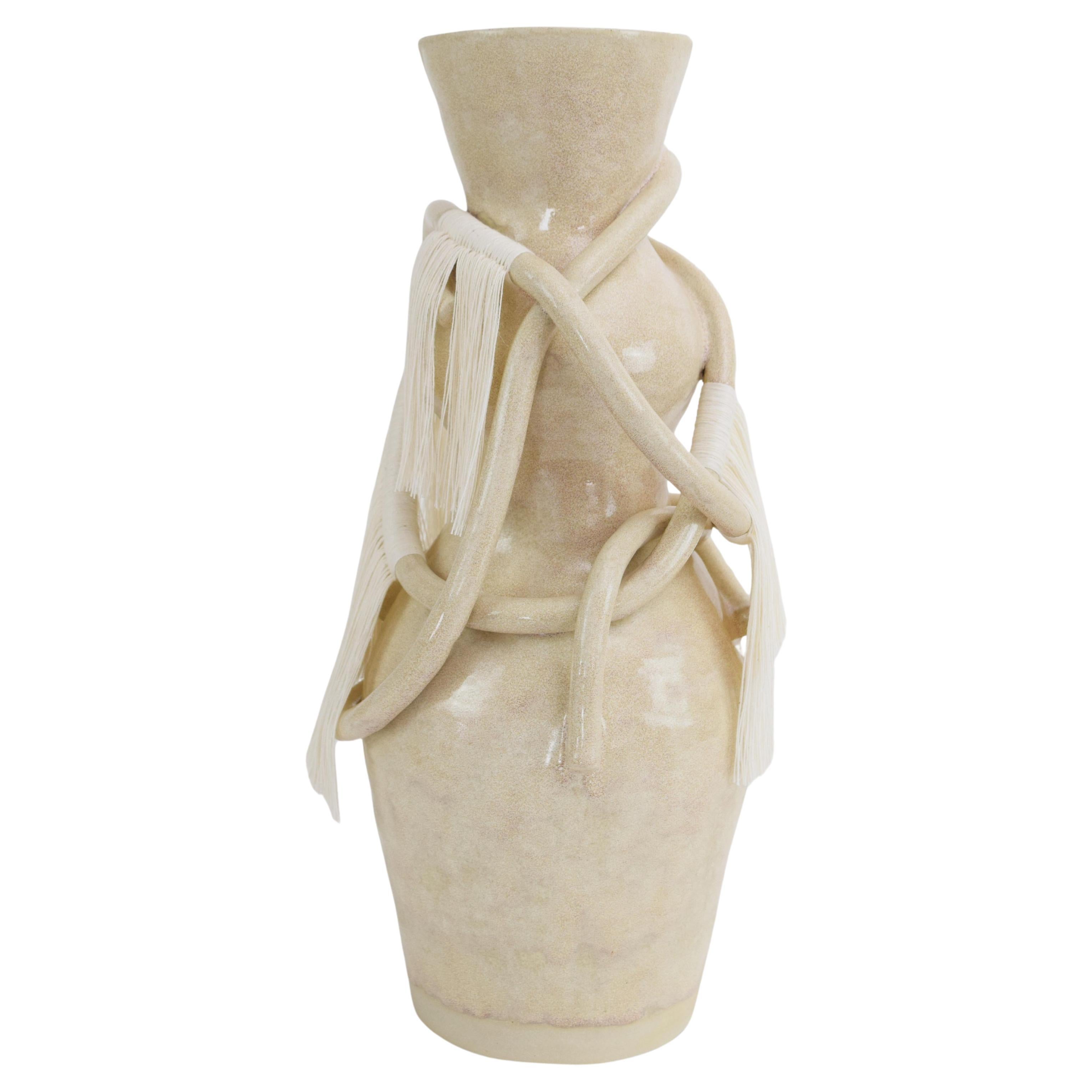 Buque nº 853 Jarrón de gres modelado a mano con vidriado moteado blanquecino. Las cuerdas de cerámica envuelven la superficie del jarrón con flecos de algodón aplicados por secciones...