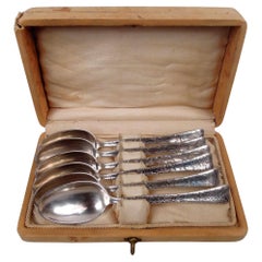Juego de postre holandés de plata de Gerritsen, 1907 Juego de 12 cucharas de postre holandesas de plata y una cuchara grande de servir de plata con mango retorcido y ovalado con b...