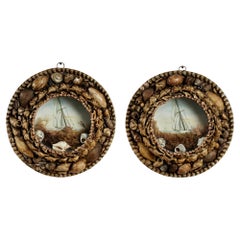 Raras e inusuales tarjetas de San Valentín de marineros ingleses del siglo XIX hechas a mano con conchas marinas exóticas. Dos alrededor de imágenes con figuras y arquitectura y una ...