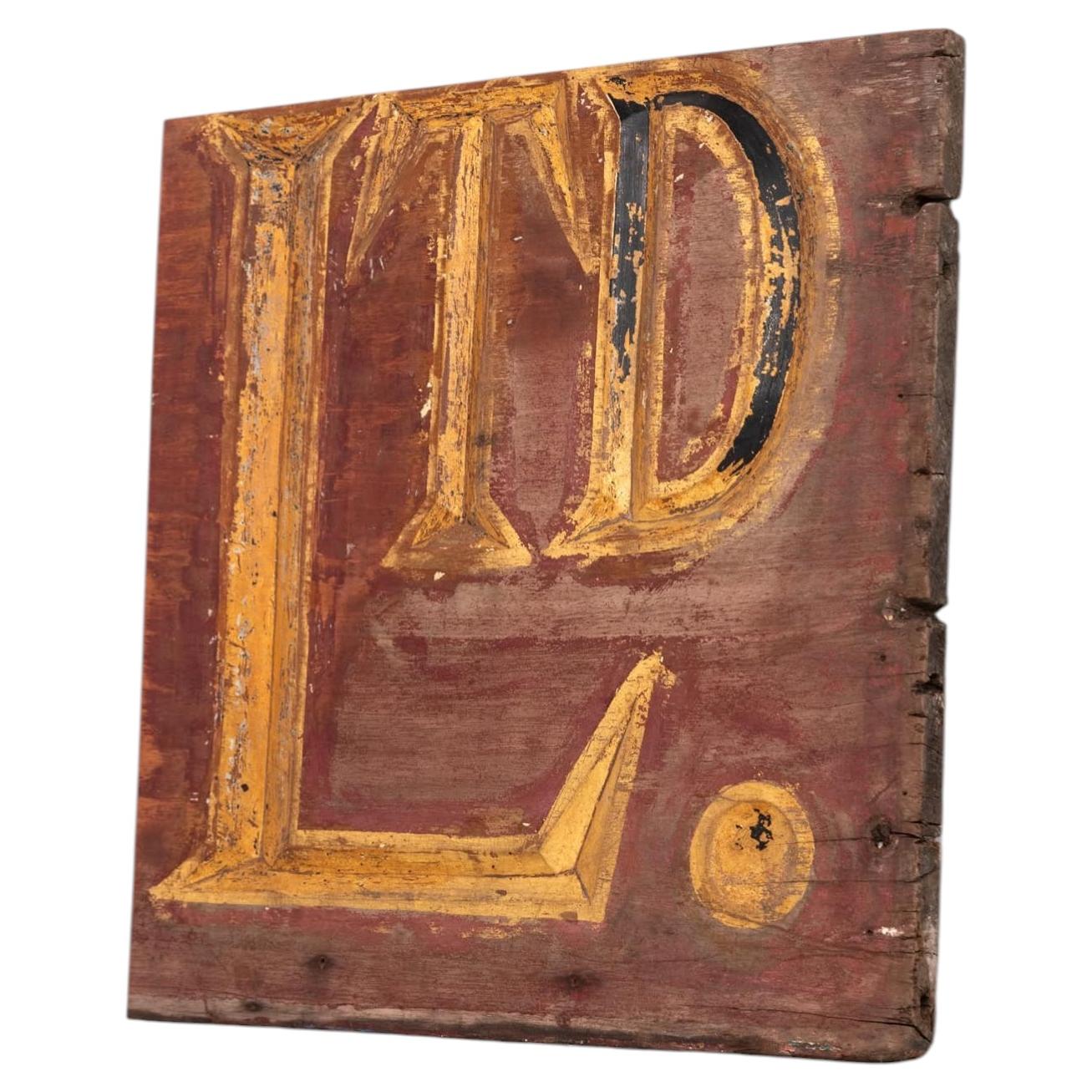 Cartel de tienda "LTD" tallado a mano y dorado. c.1900 En su día formó parte de un rótulo de tienda más grande con cristal pintado al revés en la parte superior. Preciosa pieza deco...