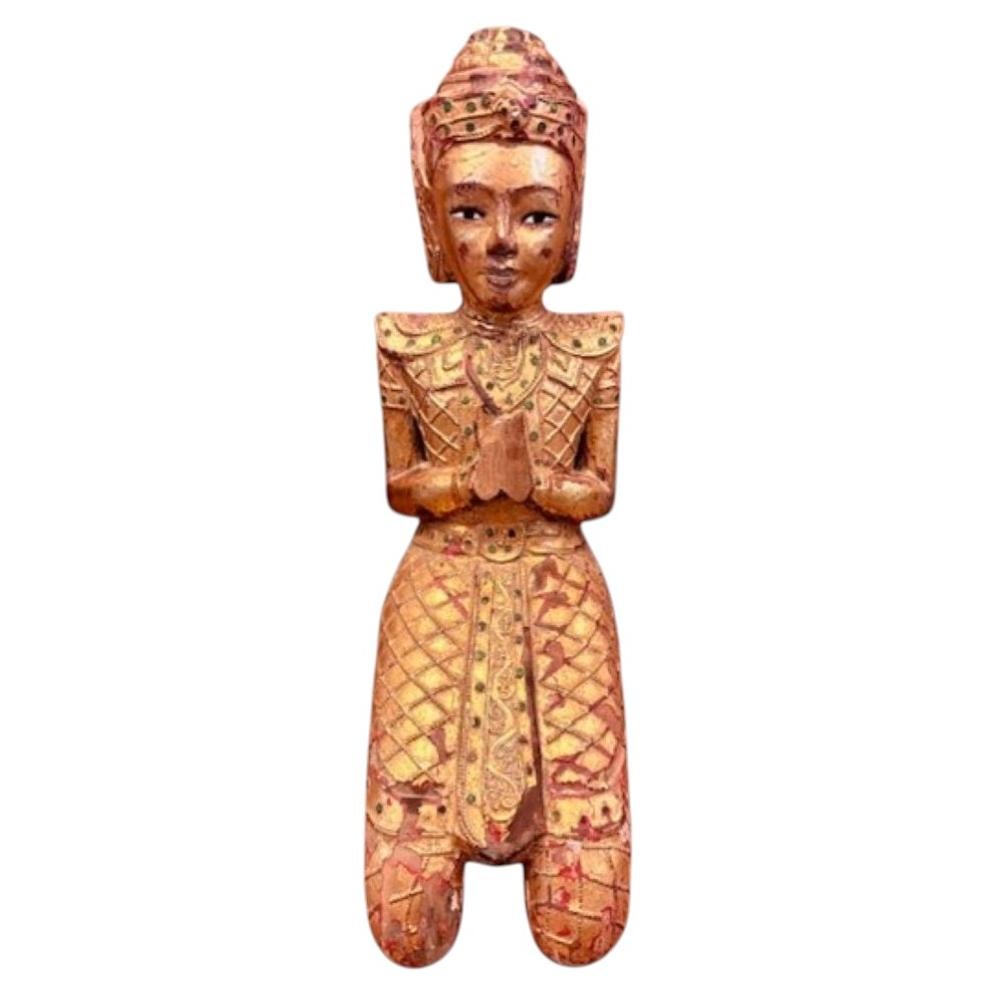 Rara y excepcional escultura antigua birmana del sudeste asiático tallada a mano y dorada en madera de teca, figura religiosa budista de templo-monasterio. Exquisitamente fabricado...