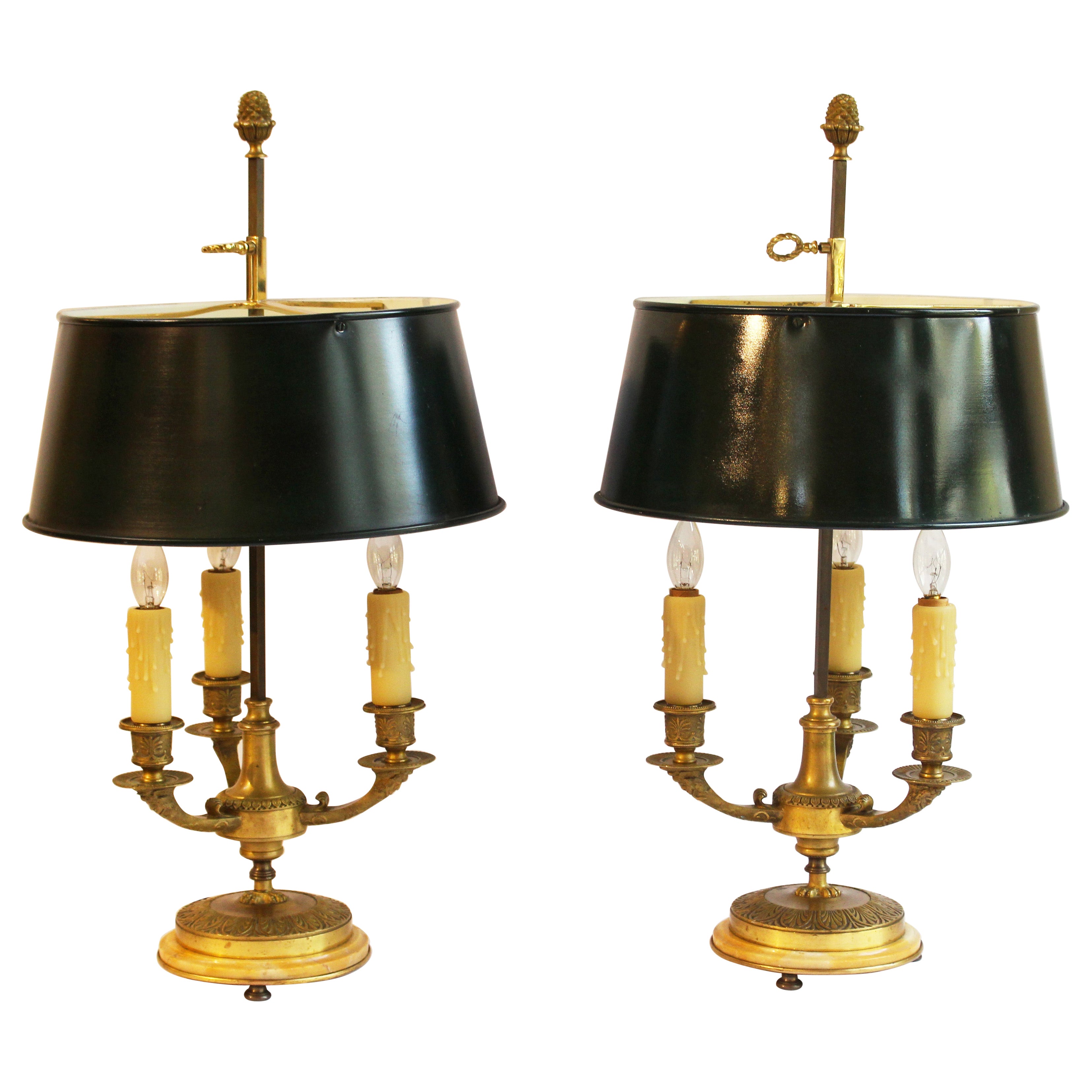 Circa 1920 Pareja de Lámparas Bouillotte Francesas de Bronce y Mármol