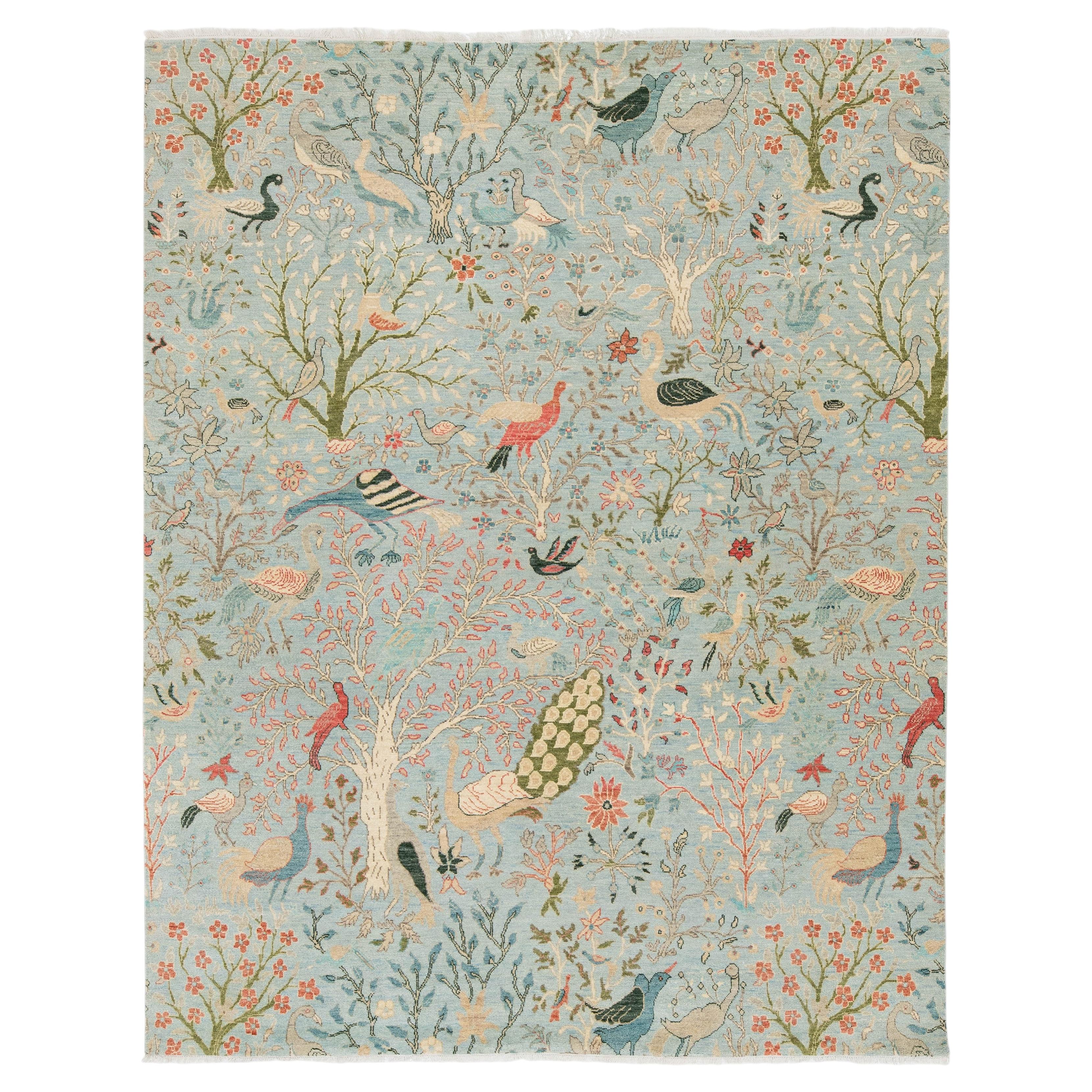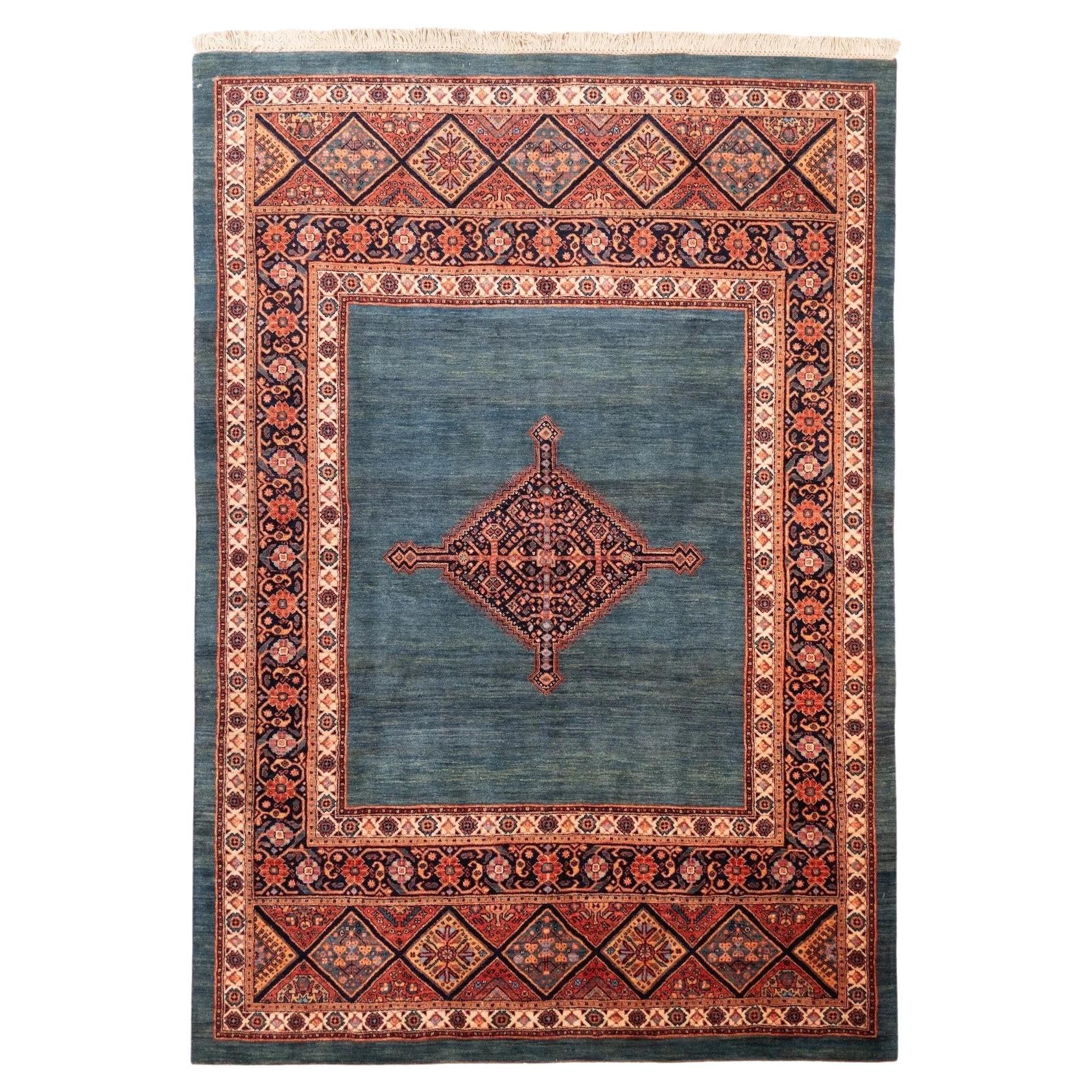 Alfombra anudada a mano de estilo moderno Serapi Lana geométrica azul y terracota 8x11