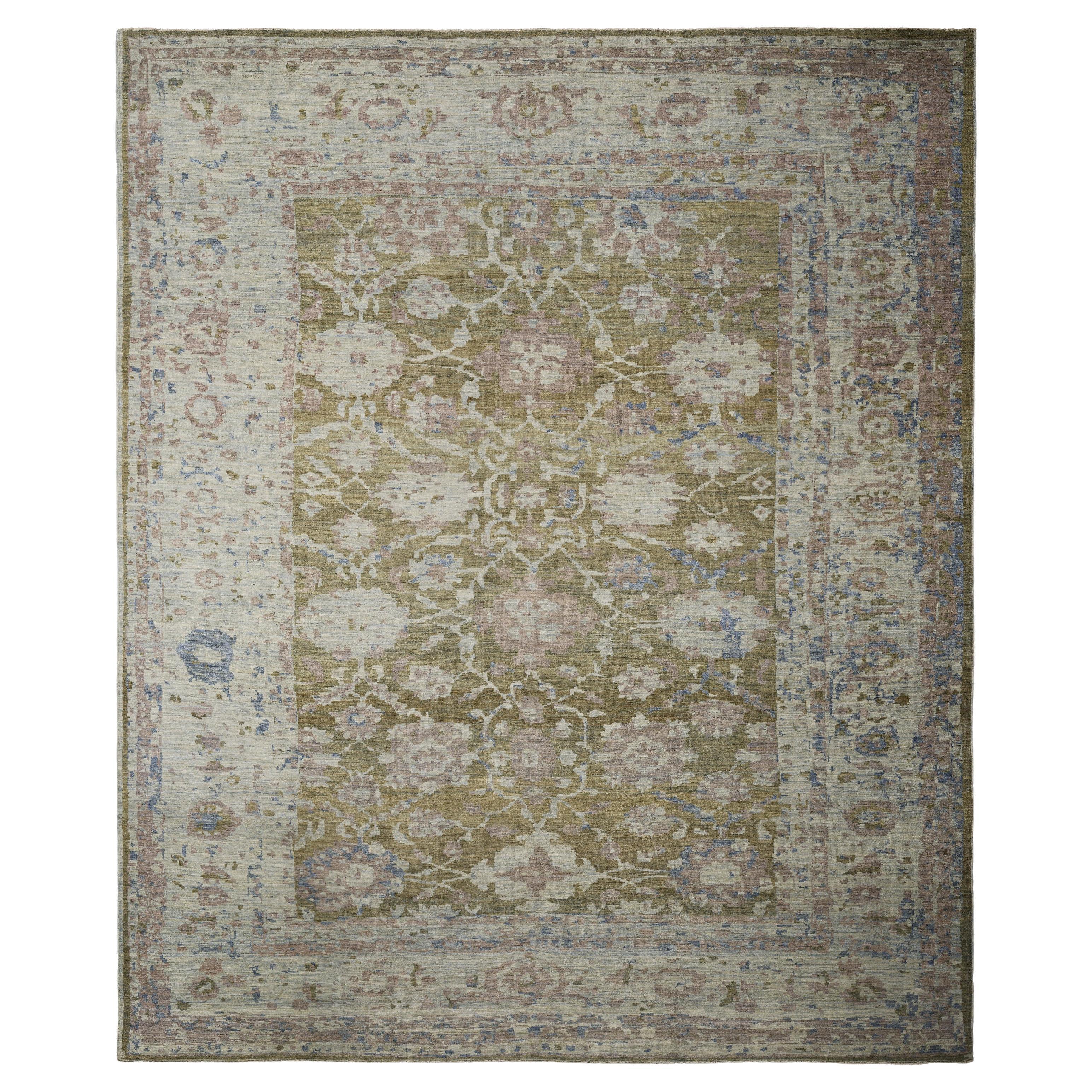 Se trata de una exquisita alfombra anudada a mano, fabricada con lana de cordero hilada a mano y lavada profesionalmente para conservar su suavidad y claridad. El campo verde musgo s...