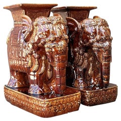 Un encantador par de taburetes o mesas auxiliares de jardín en forma de elefante de mediados de siglo, acabados en un vibrante esmalte cerámico verde esmeralda. Ricas en color y bell...