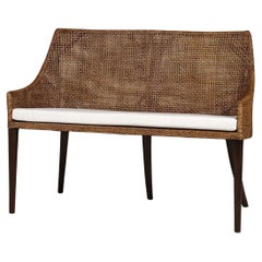Sofá clásico Polo Ralph Lauren Home de ratán natural y bambú, finales del siglo XX. Este moderno y escultural loveseat tiene cojines sueltos de lona blanca con cremallera en el asien...