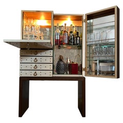 Este llamativo aparador combina piel de cabra lacada en alto brillo con una base de metal finamente trabajada, reflejando el lenguaje material experimental del diseño italiano de los...