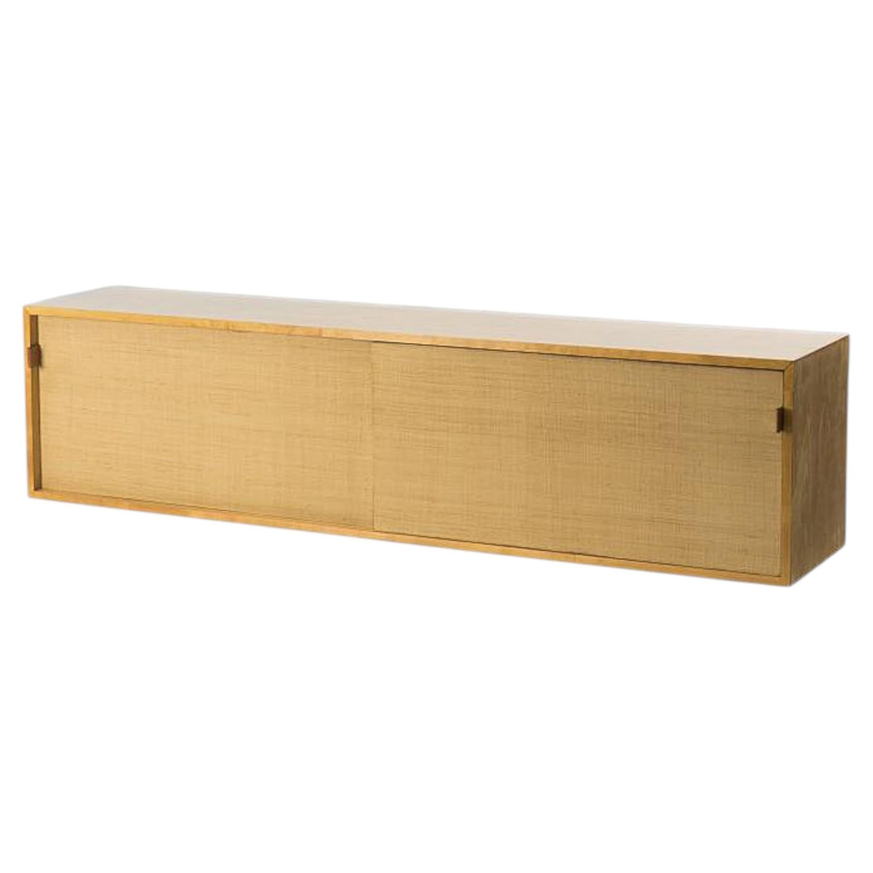 Cómoda moderna y orgánica al estilo de Michael van Beuren, con cinco cajones de cola de milano con frentes de rafia o hierba marina tejida y tiradores de caoba perfilados, todo ello ...