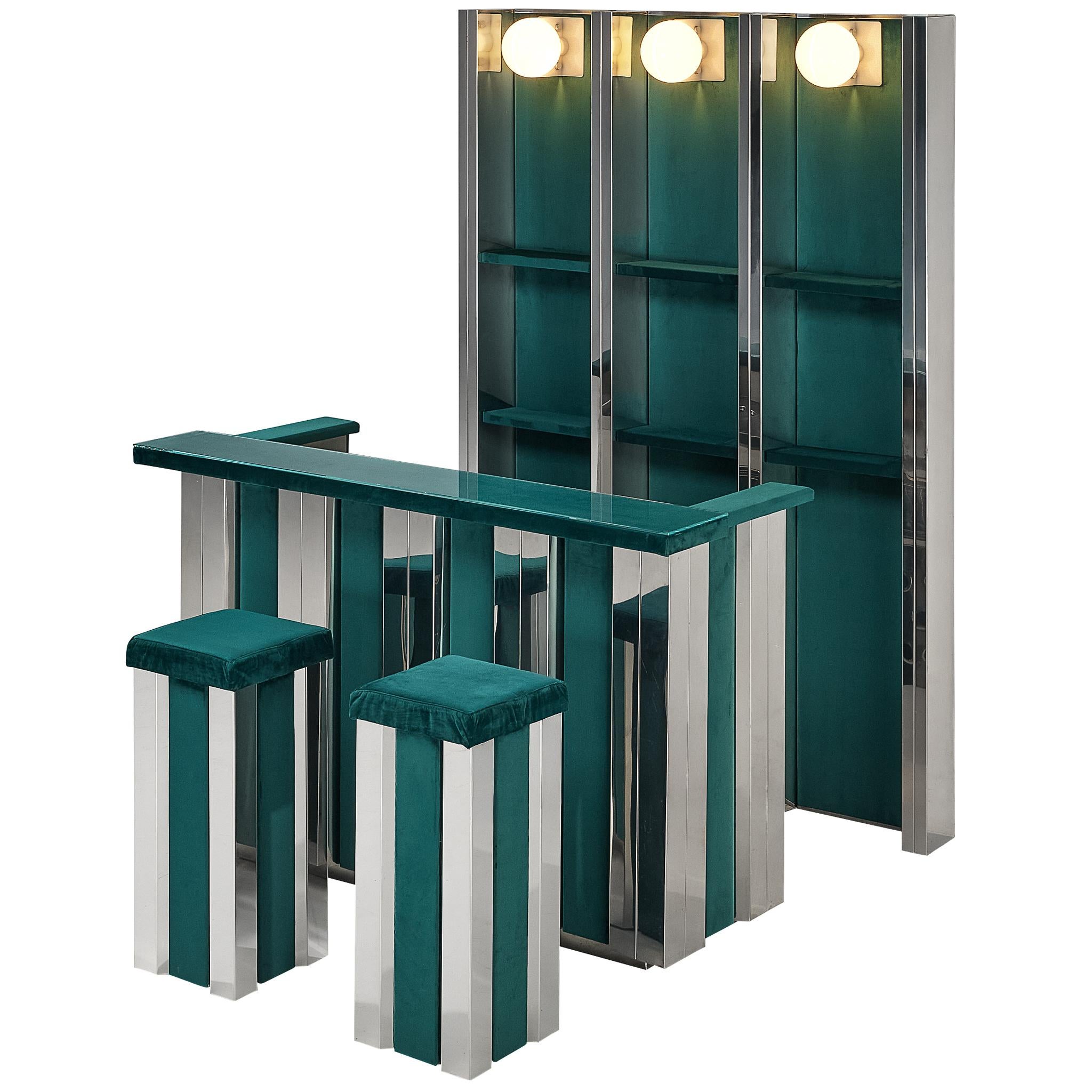 Barra de cóctel, metal, cromo, ante, cristal, latón, Italia, años 70 Coctelería de la Regencia de Hollywood al estilo de Willy Rizzo. Este llamativo conjunto incluye un elemento de ...