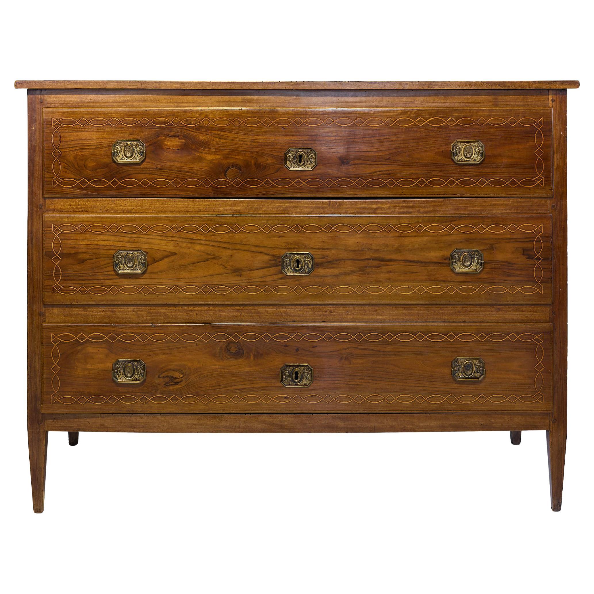 Extraordinaria cómoda italiana de nogal del siglo XIX, de estilo neoclásico, decorada con una marquetería gráfica de maderas oscuras/claras que crea movimiento y definición sobre el ...