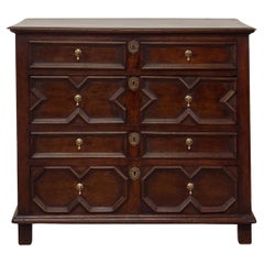 Sobresaliente cómoda inglesa de roble Carlos II del siglo XVII con cajones de varios tamaños con frentes panelados de atrevidos motivos geométricos, laterales panelados, tiradores de...
