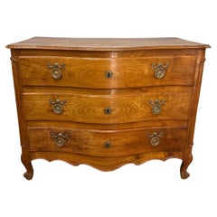 Cómoda francesa de nogal del siglo XVIII con frente de bloque serpenteado. Tallado a mano en nogal y construido con carpintería de mortaja y espiga. Tres cajones con interiores antig...