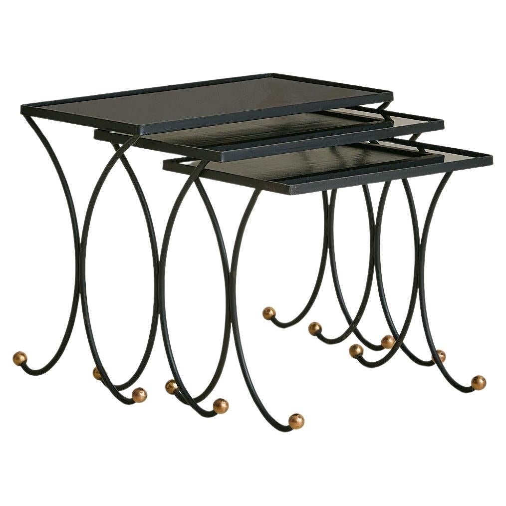 Trío de mesas nido francesas de los años 50, a la manera de Jean Royère. Cada mesa se compone de un delicado armazón de hierro con amplias patas enrolladas, rematadas por pies de bol...