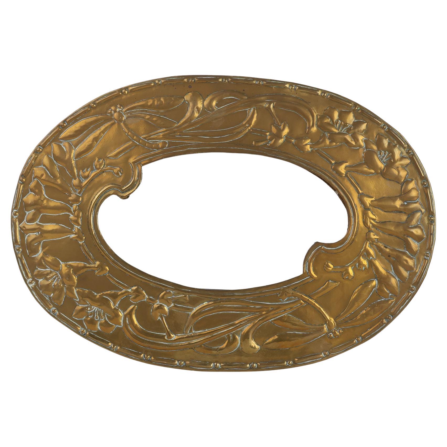 Joyero italiano de piel tostada con diseño de flor de lis repujada en oro en la parte superior, hacia mediados del siglo XX, Italia. La caja, con su forma demi-línea (media luna), ti...