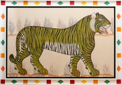 Un gran Conjunto de Dos Pinturas de Palmeras sobre lienzo en Urnas Decorativas. Cada una presenta pinturas botánicas que representan una variedad distinta de palmera con exquisito de...