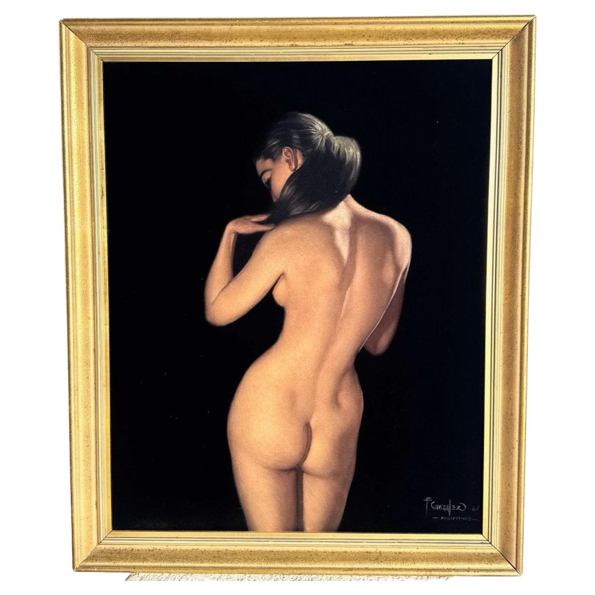 Mujer desnuda sobre terciopelo negro pintada a mano y enmarcada