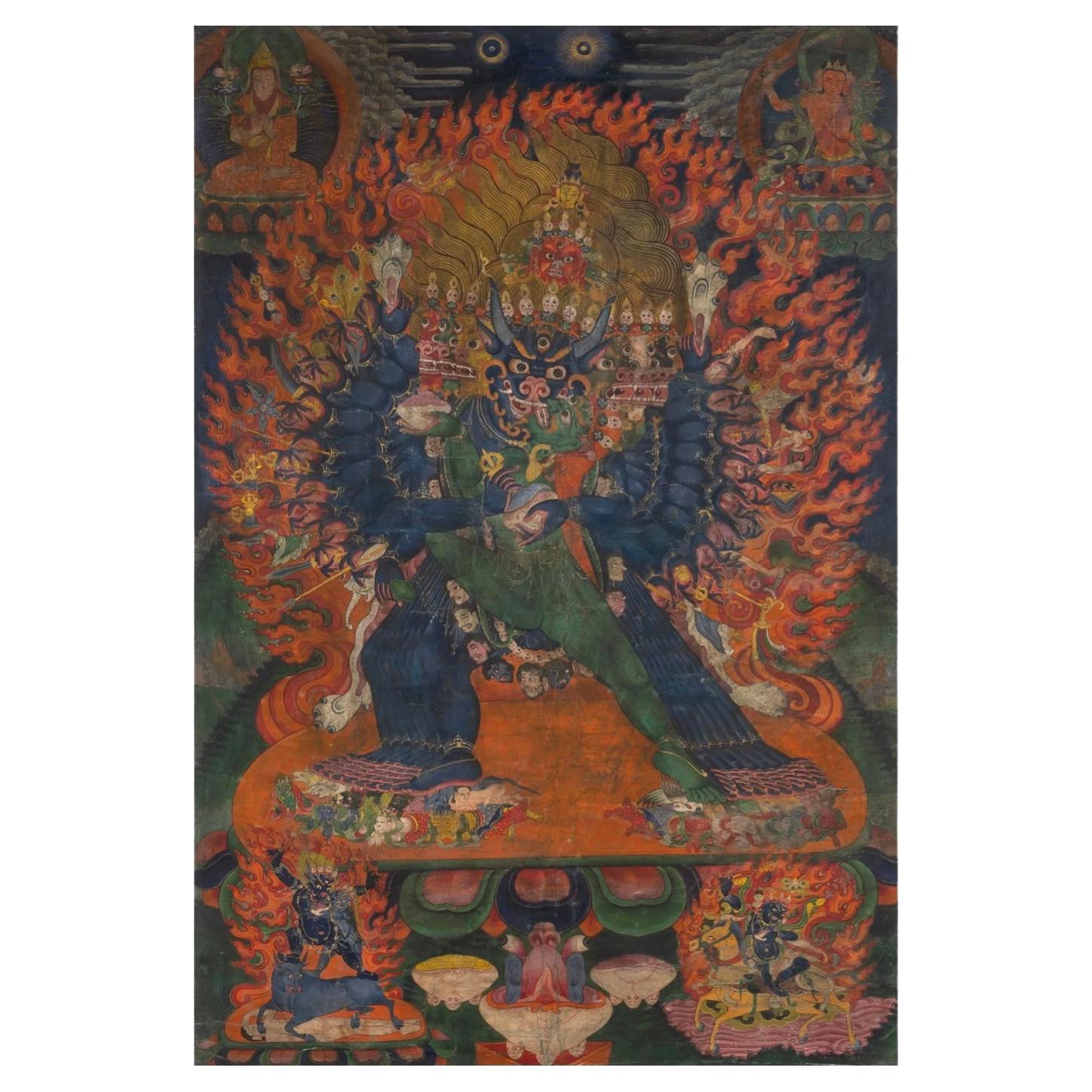 Thangka tibetano antiguo con pigmentos policromos sobre tela, de mediados a finales del siglo XIX. Representa a Yamantaka, también conocido como Vajrabhairava, que es una manifestaci...