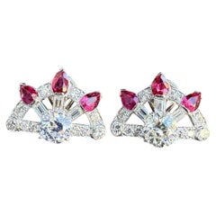 La parte superior de estos pendientes, compuesta por 2 grandes cabujones de rubí y 2 cabujones de zafiro azul, con en el centro 2 pequeños diamantes talla plena, soporta un par de pe...