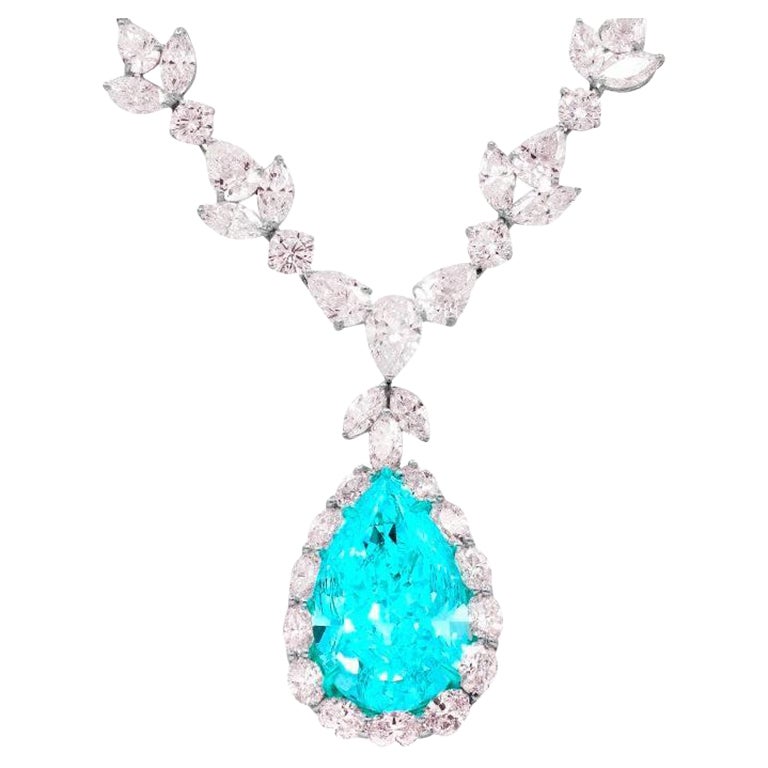 Se trata de un collar único de turmalina paraiba hecho a mano en oro amarillo de 18 quilates que combina una gran paraiba ovalada verde azulada certificada de 2 quilates procedente d...