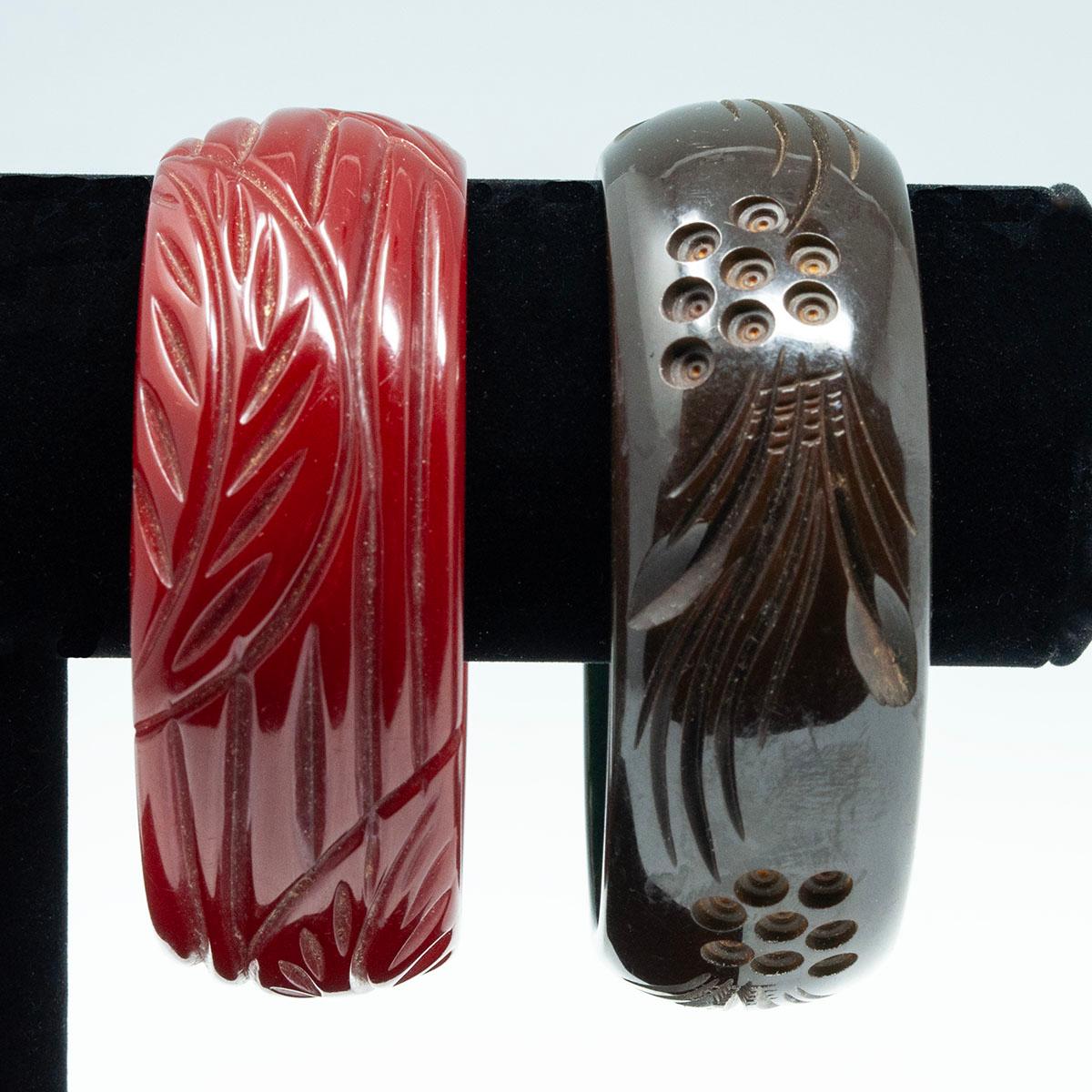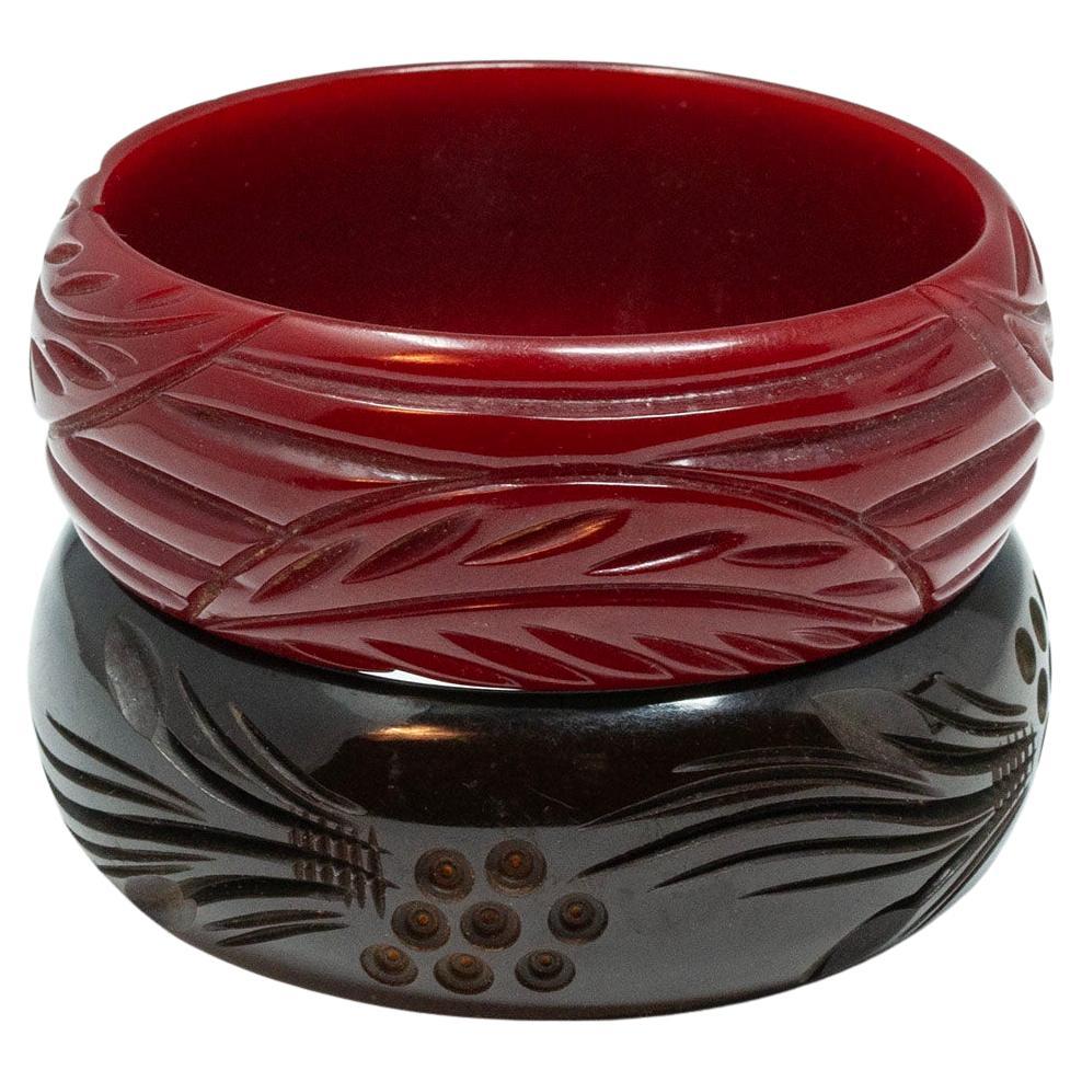 Dos brazaletes de baquelita profundamente tallados en rojo y negro.