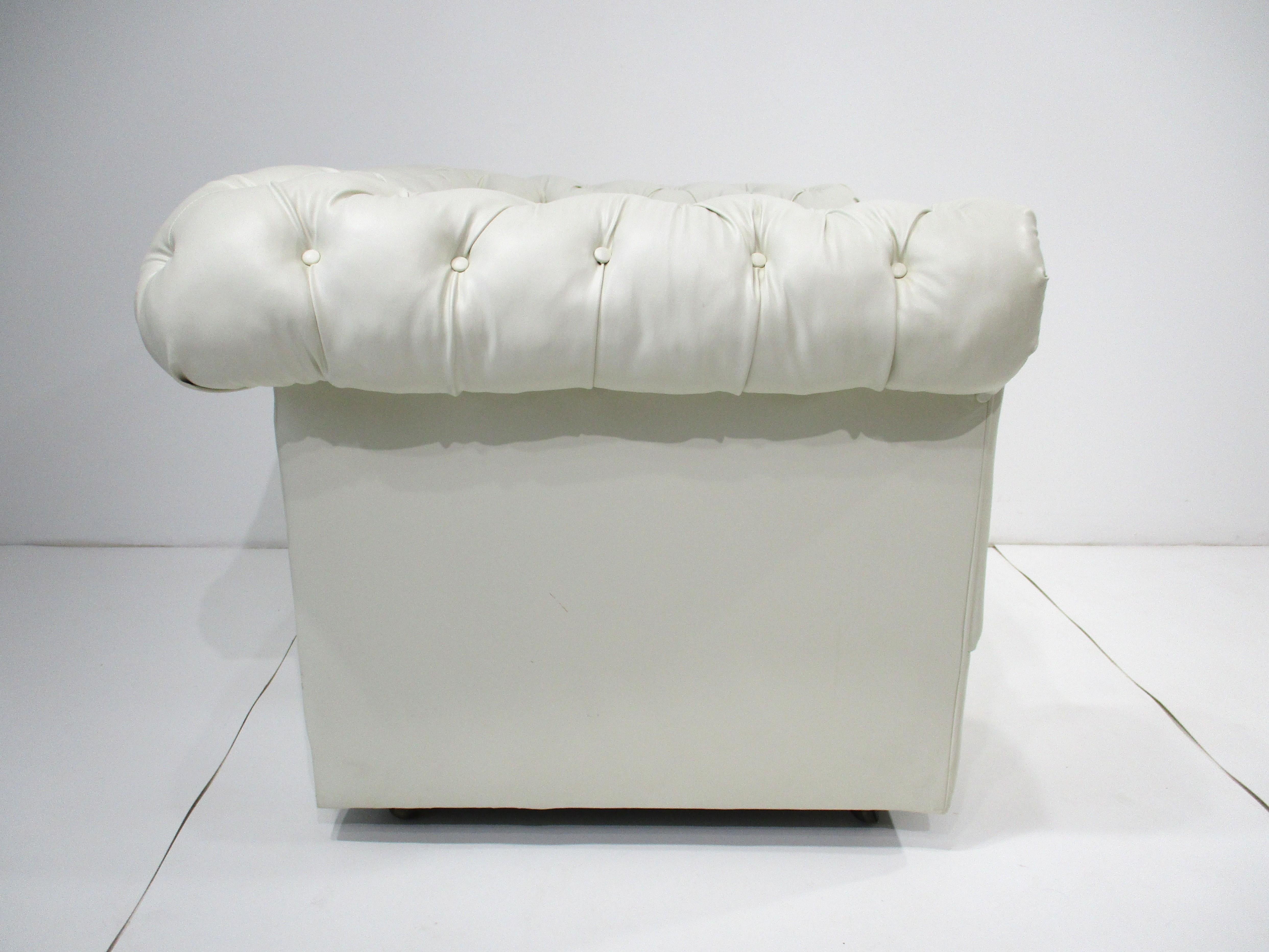 Un par de lujosas y sofisticadas tumbonas cubo empenachadas con tapicería de polipiel blanca . Estos sillones suaves y cómodos serían una declaración de intenciones en cualquier interior o espacio con un aspecto retro de chesterfield diseñado a la manera de Milo Baughman y la empresa de muebles Thayer Coggin . Fabricado en la década de 1970 y con un mínimo desgaste por el uso y el paso del tiempo.