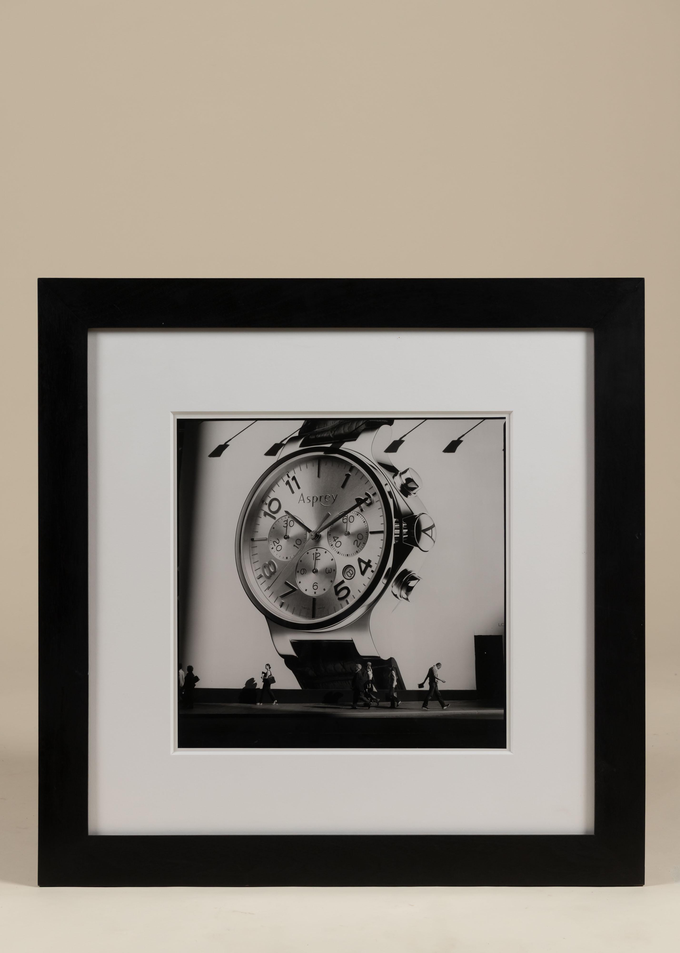 Fotografía en blanco y negro de Wouter Deruytter, Bélgica, 2005. El fotógrafo Deruytter abre las puertas a mundos pocas veces vistos, guiado por un espíritu de aventura que él compara con Tintín. Su obra abarca desde la escena drag neoyorquina hasta la recóndita vida de los jeques del petróleo, siempre equilibrando lo extremo con lo íntimo. En esta impactante imagen de Nueva York, una enorme valla publicitaria de un reloj Aprey se cierne sobre los peatones que pasan, contrastando el encanto privado con la vida pública. Sus fotografías sugieren que las personas pueden crear vidas aparte, personales y atemporales. Impresión en Gelatina de Plata, Marco de Madera. 16 "A x 20 "A