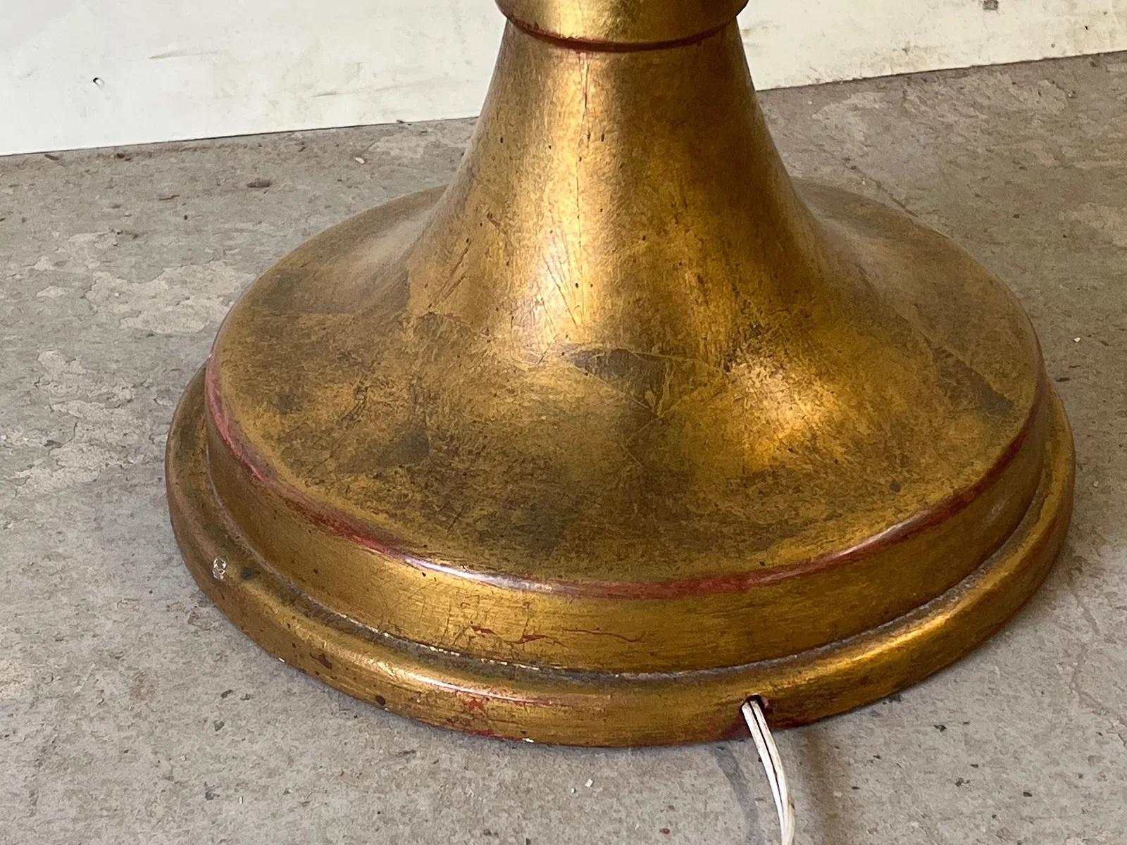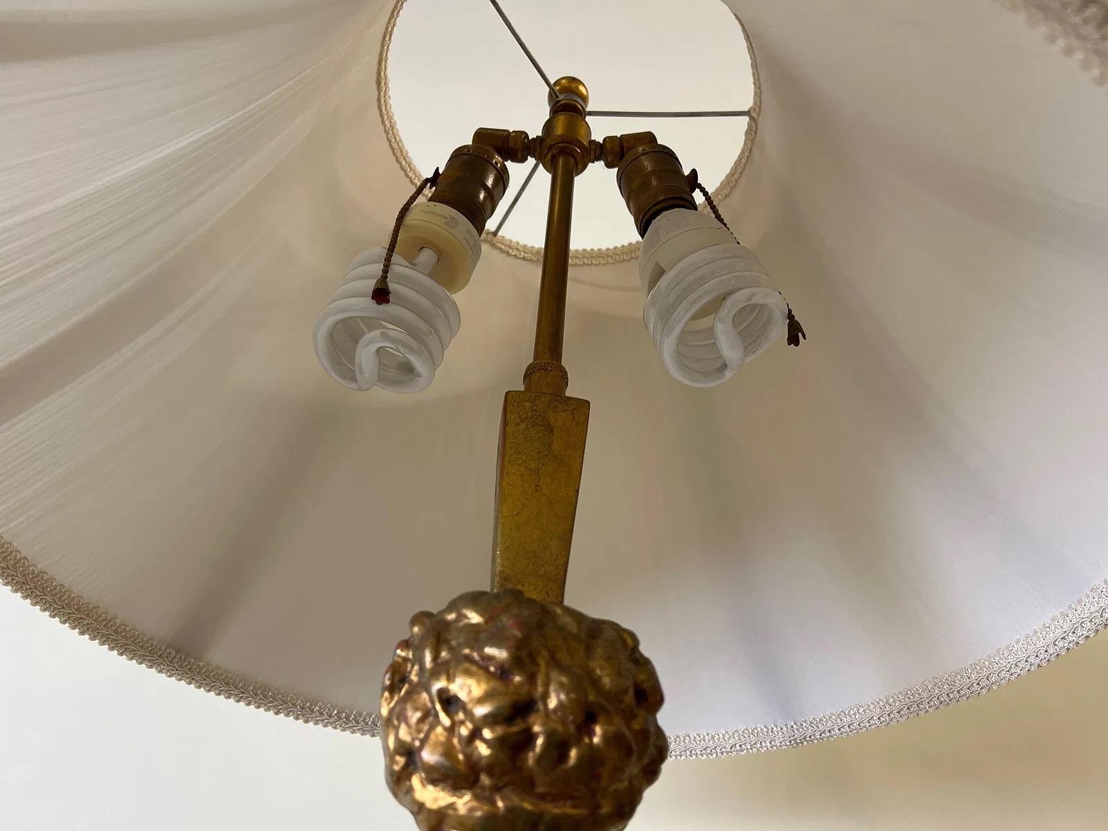 Una lámpara de pie Art Déco, chic y con carácter, atribuida a Masion Dominique. Construida con madera torneada y tallada, lacada y decorada con gesso dorado, actualmente muy patinado...