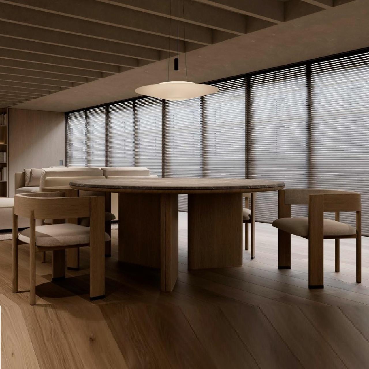Mesa de Comedor Redonda con Tres Pilares de Roble Dentados y Mármol Marron Vita