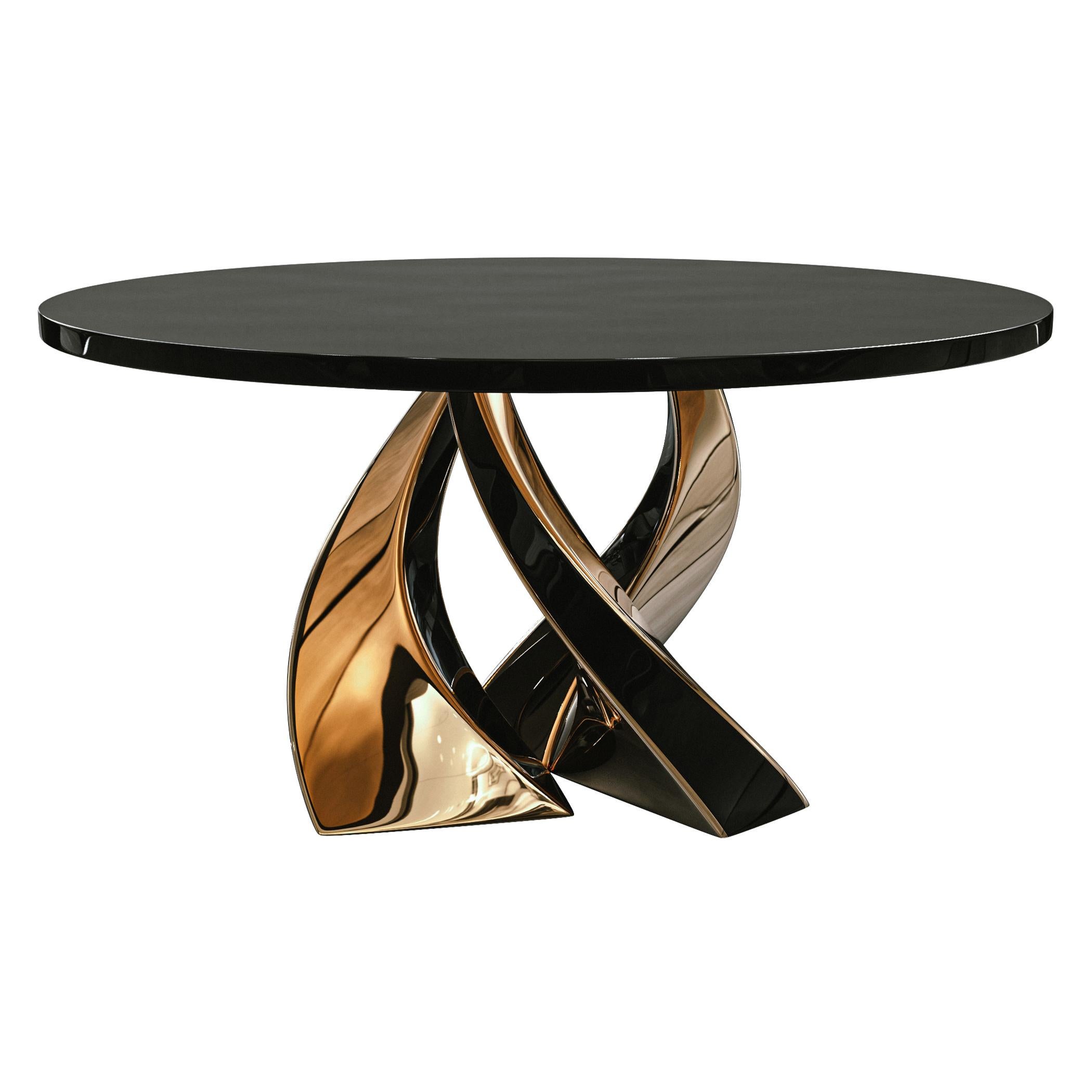 Mesa de comedor redonda personalizable con tablero de ébano y detalles de latón cepillado