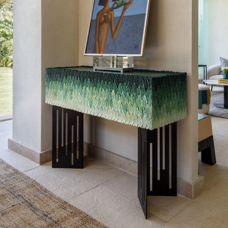 "La Consola de Salida captura la tranquila poesía de la transición: de la luz a la sombra, de la quietud al movimiento. Su superficie tallada, meticulosamente pintada a mano, evoca el ritmo natural de las hojas al cambiar de estación, traduciendo la belleza orgánica en forma estructurada.
