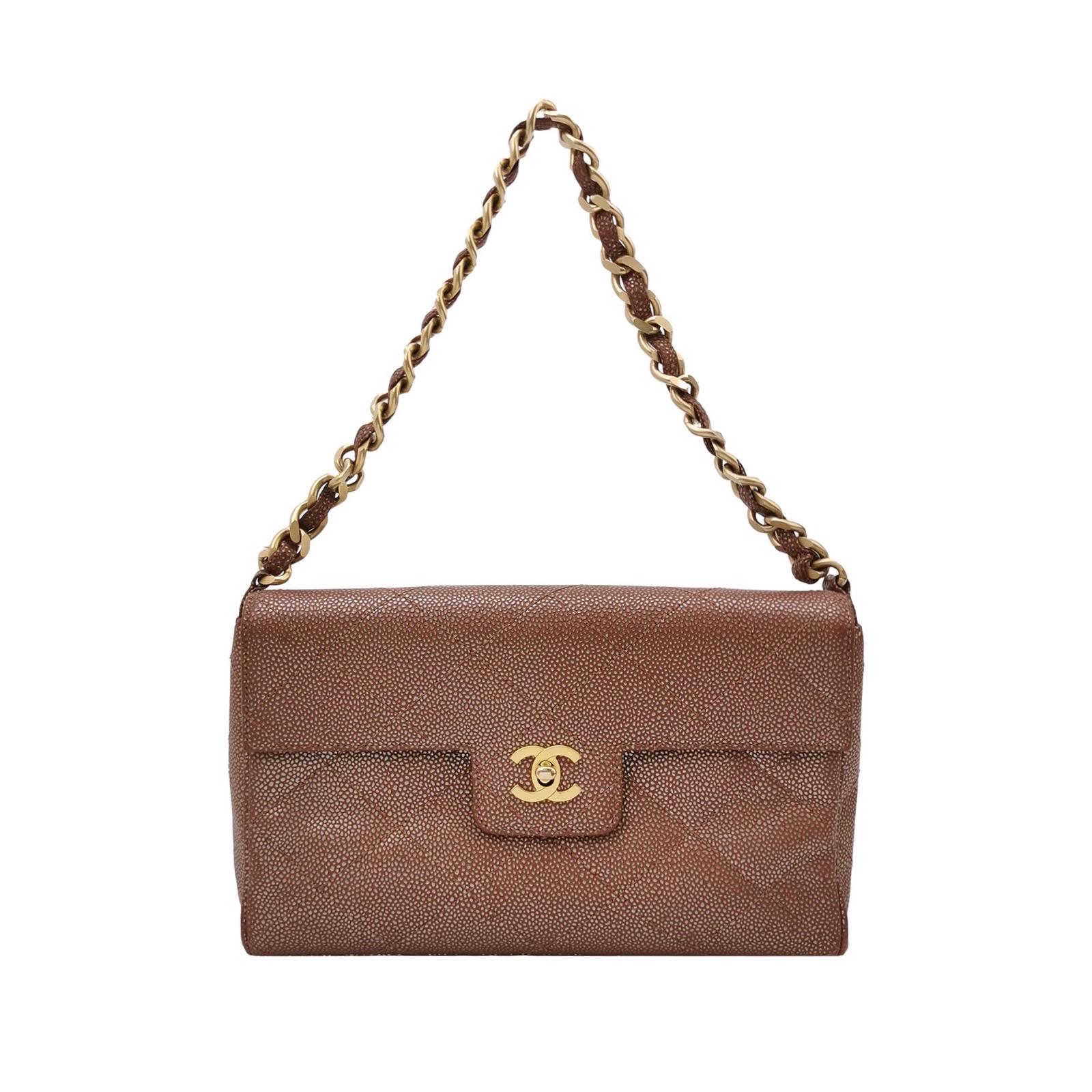 Chanel Vintage Bolso mediano de piel de caviar marrón iridiscente Herrajes dorados